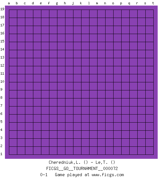 Last move : 0-1 2020 November 29 6:3:14 [Event "FICGS__GO__TOURNAMENT__000072"] [Site "FICGS"] [Date "2020.10.30"] [Round "1"] [Black "Cheredniuk,Liudmila"] [White "Le,Truongthinh"] [Result "0-1"] 0-1 This go game has been lost on time (started : 2020.10.30 1:26:40) Follow this game move after move (download)Everything happens on a grid-engraved board with black and white pieces, but if that's all you see then you don't know Go. (Pierre Audouard) A journey of a thousand sites begins with a single click. (Author unknown)