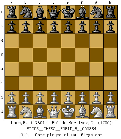 Last move : 0-1 2020 November 30 7:18:57 [Event "FICGS__CHESS__RAPID_B__000354"] [Site "FICGS"] [Date "2020.10.30"] [Round "1"] [White "Loos,Rick"] [Black "Pulido Martinez,Carlos"] [Result "0-1"] [WhiteElo "1760"] [BlackElo "1700"] 0-1 This chess game has been lost on time (started : 2020.10.30 22:33:55) Follow this game move after move (download)If your opponent offers you a draw, try to work out why he thinks he's worse off. (Nigel Short) Ein typischer, sehr verbreiteter Gedankenschädling ist der, daß der betreffende Amateur von der Annanhme ausgeht, daß jeder einzelne Zug etwas zu leisten habe. (Aaron Nimzowitsch) Cuando me preguntan: -¿Cual es el secreto que te hace hacer mejores movidas que tus oponentes?, Yo respondo: Me da gusto que me pregunten eso, porque, como veran, hay una simple razón. Yo pienso mis propias movidas y dejo a mi oponente que el piense las suyas. (Alexander Alekhine) J'ai vu le vaincu d'Echecs jouer des années durant dans l'espoir de la fête de la victoire. Car tu es plus riche de ce qu'elle existe si même elle n'est point pour toi. Ainsi de la perle du fond des mers. (Antoine de Saint-Exupéry) Those parts of the system that you can hit with a hammer (not advised) are called hardware; those program instructions that you can only curse at are called software. (Anonymous)