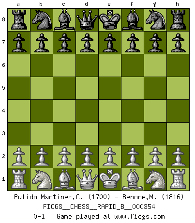 Last move : 0-1 2020 November 30 7:18:57 [Event "FICGS__CHESS__RAPID_B__000354"] [Site "FICGS"] [Date "2020.10.30"] [Round "1"] [White "Pulido Martinez,Carlos"] [Black "Benone,Mateia"] [Result "0-1"] [WhiteElo "1700"] [BlackElo "1816"] 0-1 This chess game has been lost on time (started : 2020.10.30 22:33:55) Follow this game move after move (download)Chess holds its master in its own bonds, shackling the mind and brain so that the inner freedom of the very strongest must suffer. (Albert Einstein) Der vorletzte Fehler gewinnt. (Savielly Grigorievitsch Tartakower) No soy una persona materialista y por eso, no resiento la falta o pérdida del dinero. La ausencia de cosas mundanas carece de importancia. Ya que el Ajedrez es una forma en la que puedo ser tan materialista como yo desee sin tener la necesidad de vender mi alma. (Jamie Walter Adams) Vous n'êtes pas toujours obligé de jouer le meilleur coup. Un coup doit être actif, entreprenant, correct et beau ! (David Bronstein) In fact if nothing is done against this teddy bear, hereby I announce that I would quit chess, rapid chess, blitz chess, postal chess, email chess, server chess and correspondence chess I will then switch to a table game where teddy bears aren't going to be seen for a while, like Poker, or Roulette, all 18+ games. (Elmer Valderrama)