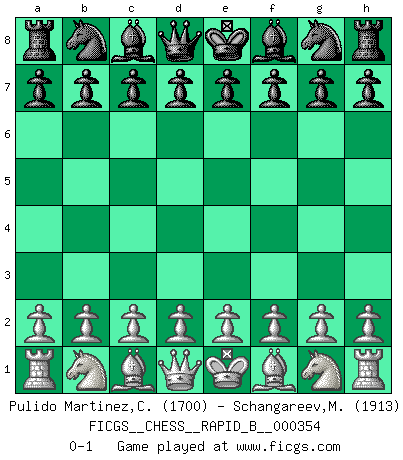 Last move : 0-1 2020 November 30 7:18:57 [Event "FICGS__CHESS__RAPID_B__000354"] [Site "FICGS"] [Date "2020.10.30"] [Round "1"] [White "Pulido Martinez,Carlos"] [Black "Schangareev,Mirzian"] [Result "0-1"] [WhiteElo "1700"] [BlackElo "1913"] 0-1 This chess game has been lost on time (started : 2020.10.30 22:33:55) Follow this game move after move (download)I have added these principles to the law: get the Knights into action before both Bishops are developed. (Emanuel Lasker) Computer sind die einzigen Gegner, die nicht immer eine Ausrede auf Lager haben, wenn sie gegen mich verlieren. (Robert James Fischer) La última cosa en que Fischer estaba interesado era en tonterías, siempre y cuando el Ajedrez estuviera involucrado. (Elie Agur) Les échecs sont un jeu terrible. Si vous n'avez pas le centre, votre adversaire a une position plus libre. Par contre, si vous avez le centre, alors vous avez vraiment quelque chose pour laquelle vous inquiéter ! (Siegbert Tarrasch) . 'gn is not allowed in chess unless n is an integer between 1 and 8 inclusive, where 1 and 8 are to interpreted as the standard numerals standing for integers in the ordered real-closed field R, with the *canonical* ordering. (As opposed to, say, an integer in the domain Z[2+i*sqrt(5)] or an integer in some exotic Grothendieck topos). (Normajean Yates)
