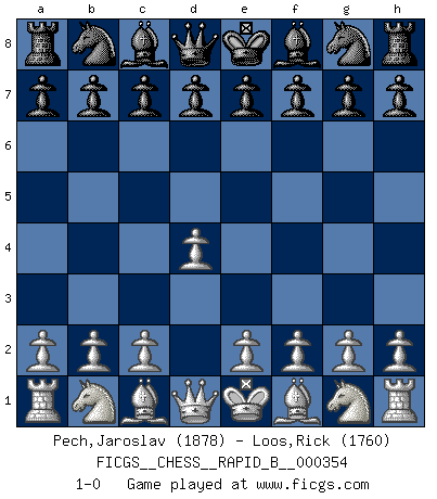 Last move : 1-0 2020 November 30 19:36:42 [Event "FICGS__CHESS__RAPID_B__000354"] [Site "FICGS"] [Date "2020.10.30"] [Round "1"] [White "Pech,Jaroslav"] [Black "Loos,Rick"] [Result "1-0"] [WhiteElo "1878"] [BlackElo "1760"] 1.d4 1-0 This chess game has been lost on time (started : 2020.10.30 22:33:55) Follow this game move after move (download)Avoid the crowd. Do your own thinking independently. Be the Chess player, not the Chess piece. (Ralph Charell) Alle offensichtlichen Züge sehen nach dem Spiel in der Analyse verdächtig aus. (Viktor Kortschnoi) En posiciones complicadas, Bobby Fischer pocas veces tuvo que temer de cualquiera. (Paul Keres) Ce qui est bien, c'est d'avoir tout un tas de pièces en prise : l'adversaire ne peut en prendre qu'une à la fois. Cité par Thierry Audin. Hardware: the parts of a computer that can be kicked. (Jeff Persis)