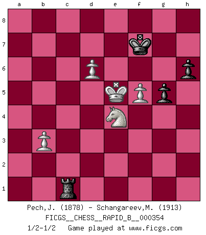 Last move : 1/2-1/2 2021 January 28 0:17:50 [Event "FICGS__CHESS__RAPID_B__000354"] [Site "FICGS"] [Date "2020.10.30"] [Round "1"] [White "Pech,Jaroslav"] [Black "Schangareev,Mirzian"] [Result "1/2-1/2"] [WhiteElo "1878"] [BlackElo "1913"] 1.c4 e5 2.Nc3 Nf6 3.Nf3 Nc6 4.g3 d5 5.cxd5 Nxd5 6.Bg2 Nb6 7.O-O Be7 8.d3 O-O 9.a3 a5 10.Be3 Be6 11.Rc1 a4 12.Bxb6 cxb6 13.Qc2 Nd4 14.Nxd4 exd4 15.Ne4 Bd5 16.Qc7 Re8 17.Qxd8 Raxd8 18.Rc2 Bf8 19.Bf3 b5 20.Ra1 b4 21.axb4 Bxb4 22.Rxa4 Bb3 23.Rxb4 Bxc2 24.g4 Re5 25.Kf1 h6 26.Nd2 Ra5 27.Rxb7 Ba4 28.b3 Bd7 29.Kg2 Rb5 30.Rxd7 Rxd7 31.Bc6 Rbd5 32.Kg3 Kf8 33.Nf3 g5 34.Bxd5 Rxd5 35.h4 f6 36.hxg5 fxg5 37.Nd2 Re5 38.Ne4 Re7 39.f4 Kg7 40.f5 Re5 41.Kf3 Rb5 42.Nd2 Rb7 43.Ke4 Re7+ 44.Kxd4 Rxe2 45.Ne4 Rg2 46.Ke5 Rxg4 47.d4 Rg1 48.d5 Kf7 49.d6 Rc1 1/2-1/2 Follow this game move after move (download)Pawn endings are to Chess what putting is to golf. (Cecil Purdy) Am wohlsten fühle ich mich, wenn ich sehe, wie sich mein Gegner im Todeskampf windet. (Robert James Fischer) Bobby es el jugador de Ajedrez mas fino que este país jamás haya producido. Su memoria para las movidas, su brillantez en soñar combinaciones y su feróz determinación por la victoria son algo extraño. (John Collins) Il n'y a plus de joueurs du niveau de Jacob Murray dont la seule quête est le beau jeu, le plaisir de voir les pièces construire quelque chose. Sur 10 idées à la minute, 9 seront sans intérêt, la dernière s'avèrera géniale. (Christian Bauer) A generalist learns less and less about more and more until he knows nothing about everything. (Author unknown)