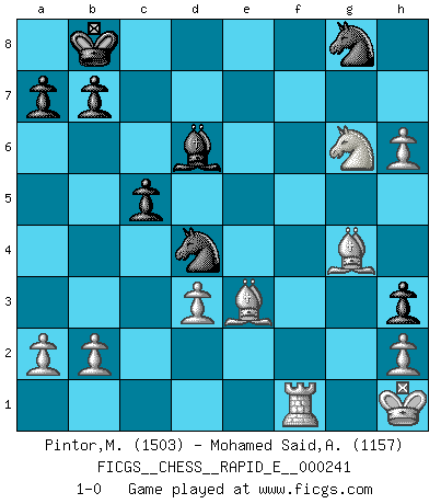 Last move : 1-0 2020 November 11 18:41:7 [Event "FICGS__CHESS__RAPID_E__000241"] [Site "FICGS"] [Date "2020.10.31"] [Round "1"] [White "Pintor,Manuel"] [Black "Mohamed Said,Azaim"] [Result "1-0"] [WhiteElo "1503"] [BlackElo "1157"] 1.e4 c5 2.f4 d5 3.exd5 Qxd5 4.Nf3 Bg4 5.Nc3 Qe6+ 6.Be2 Bxf3 7.gxf3 Nc6 8.O-O O-O-O 9.Ne4 Rd5 10.Bc4 Qg6+ 11.Ng3 Rd4 12.d3 h5 13.f5 Qf6 14.c3 h4 15.Ne4 Qxf5 16.cxd4 Nxd4 17.Ng5 f6 18.Nf7 Rh5 19.Kh1 g5 20.f4 Qg6 21.fxg5 h3 22.Qg4+ f5 23.Qf4 Qc6+ 24.Rf3 Qxf3+ 25.Qxf3 Nxf3 26.Be6+ Kb8 27.Bxf5 Rh4 28.Be3 e5 29.Rf1 Nd4 30.Nxe5 Bd6 31.Ng6 Rh7 32.Bg4 Rh6 33.gxh6 1-0 Follow this game move after move (download)Of all my Russian books, the defense contains and diffuses the greatest 'warmth' which may seem odd seeing how supremely abstract Chess is supposed to be. (Vladimir Nabokov) Der Traum, für den ich lebe, ist der von einem freien Russland. Viele mögen sagen: Russland hat doch ein Parlament, einen gewählten Präsidenten. Aber ich spüre, dass in meiner Heimat die Angst wiederkehrt. Eine Angst, sich frei zu äußern, bestimmte Dinge zu tun (Garry Kasparov) Yo jugué Ajedrez con el y a veces le pude haber ganado solo que siempre devuelve su última jugada y juega la partida de manera diferente. (Mark Twain) Plusieurs personnes se sont demandées comment Tal faisait pour gagner... En fait, c'est très simple ! Il met ses pièces au centre de l'échiquier et les sacrifie quelque part ! (David Bronstein) Computers are like Old Testament gods; lots of rules and no mercy. (Joseph Campbell)