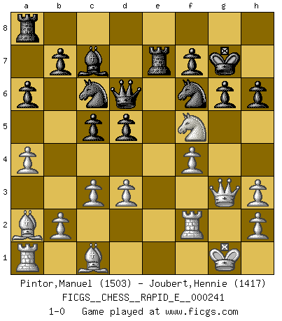 Last move : 1-0 2020 November 25 20:32:58 [Event "FICGS__CHESS__RAPID_E__000241"] [Site "FICGS"] [Date "2020.10.31"] [Round "1"] [White "Pintor,Manuel"] [Black "Joubert,Hennie"] [Result "1-0"] [WhiteElo "1503"] [BlackElo "1417"] 1.e4 c5 2.f4 e6 3.Nf3 Nc6 4.Bc4 d6 5.O-O Nf6 6.d3 a6 7.a4 Be7 8.Ng5 h6 9.Nh3 O-O 10.c3 d5 11.exd5 exd5 12.Ba2 Bxh3 13.gxh3 Bd6 14.Qf3 Bc7 15.Nd2 Qd6 16.Rf2 Rfe8 17.Qg3 g6 18.Nf3 Re7 19.Nh4 Kg7 20.Nf5+ 1-0 Follow this game move after move (download)For me, Chess is life and every game is like a new life. Every Chess player gets to live many lives in one lifetime. (Eduard Gufeld) Mein Name ist Rustam Kamsky. Sie haben meinen Sohn belästigt. Bereiten Sie sich aufs Sterben vor. (Rustam Kamsky) Yo considero que Fischer es uno de los expertos mas grandes de aperturas de siempre. (Keith Hayward) Les écrivains ont utilisé les échecs pour analyser les côtés extrêmes de la nature humaine. Dans ce cadre, les échecs offrent un champ d'expérimentation idéal. Mais on pourrait faire la même chose avec la peinture. Et là, en vous référant à Van Gogh, vous ne tirerez pas de conclusion définitive sur les peintres. (Gary Kasparov) Chess is as much a mystery as women. (Purdy)