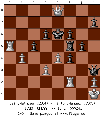 Last move : 1-0 2020 November 17 14:10:31 [Event "FICGS__CHESS__RAPID_E__000241"] [Site "FICGS"] [Date "2020.10.31"] [Round "1"] [White "Bain,Mathieu"] [Black "Pintor,Manuel"] [Result "1-0"] [WhiteElo "1284"] [BlackElo "1503"] 1.e4 e5 2.Nf3 Nc6 3.Bb5 Qf6 4.d3 Bc5 5.O-O d6 6.Bg5 Qg6 7.Nc3 f6 8.Nd5 Bb6 9.Be3 Kd8 10.a4 Bg4 11.Bxb6 axb6 12.c3 Nge7 13.Nh4 Qg5 14.f3 Bh3 15.Bxc6 bxc6 16.Nxe7 Kxe7 17.Qe1 g6 18.Qf2 Kd7 19.f4 exf4 20.Nf3 Qg4 21.Kh1 c5 22.gxh3 Qxh3 23.b4 cxb4 24.cxb4 g5 25.Qa2 Rhe8 26.Qf7+ Re7 27.Qc4 Rc8 28.Nd4 c5 29.Nf5 Re6 30.Qb5+ Rc6 31.a5 bxa5 32.Rf2 Re5 33.Rxa5 Ke6 34.Qxc6 Rxf5 35.Qe8+ 1-0 Follow this game move after move (download)First-class players lose to second class players because second-class players sometimes play a first-class game. (Tarrasch) Ich hatte meine größten Erfolge, als ich 47 Jahre alt war. Kasparow war noch nicht mal 42 und hat das Schach schon im Stich gelassen. (Viktor Kortschnoi) No existe un remordimiento como el remordimiento del Ajedrez. (H. G. Wells) Il a essayé de se convaincre qu'il pourrait empêcher toutes les erreurs et ne jamais perdre. L'horreur ! Gary Kasparov au sujet de Robert Fischer. When you have everything, sometimes it feels like nothing. (Horatio Caine, C.S.I. Miami)