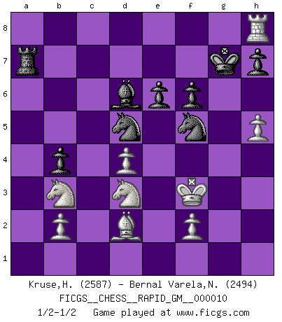 Last move : 1/2-1/2 2021 February 16 12:45:36 [Event "FICGS__CHESS__RAPID_GM__000010"] [Site "FICGS"] [Date "2020.10.31"] [Round "1"] [White "Kruse,Herbert"] [Black "Bernal Varela,Nelson"] [Result "1/2-1/2"] [WhiteElo "2587"] [BlackElo "2494"] 1.Nf3 e6 2.g3 d5 3.c4 dxc4 4.Qa4+ Nd7 5.Bg2 a6 6.Qxc4 b5 7.Qc2 Bb7 8.a4 c5 9.O-O Ngf6 10.Nc3 Bc6 11.Ng5 Bxg2 12.Kxg2 c4 13.axb5 axb5 14.Rxa8 Qxa8+ 15.Nf3 Qa6 16.d3 b4 17.Nb1 cxd3 18.Qxd3 Qxd3 19.exd3 Be7 20.Be3 O-O 21.Rc1 Nd5 22.Nbd2 Ra8 23.h4 f6 24.d4 N7b6 25.Ne1 Nc8 26.Nd3 Nd6 27.Kf3 Kf7 28.h5 g6 29.Nb3 Ra2 30.g4 gxh5 31.gxh5 Nf5 32.Rc8 Ra7 33.Bd2 Bf8 34.Rb8 Bd6 35.Rh8 Kg7 1/2-1/2 Follow this game move after move (download)What would Chess be without silly mistakes ? (Kurt Richter) Es hat in meinem Leben Zeiten gegeben, da ich sehr nahe daran war zu glauben, daß ich auch nicht eine einzige Schachpartie verlieren könnte. (José Raúl Capablanca) Mis oponentes también hacen buenas movidas. A veces yo no tomo esas cosas en consideración. (Bobby Fischer) Le jeu d'échecs est comme rejeté hors du temps. (Antoine de Saint-Exupéry) When you've done things right people won't know you've done anything at all. (Futurama)