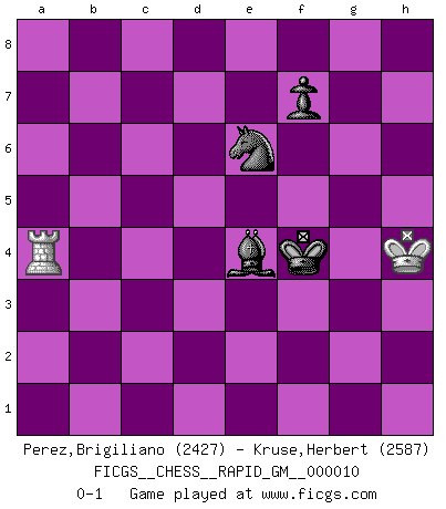 Last move : 0-1 2021 March 20 0:12:53 [Event "FICGS__CHESS__RAPID_GM__000010"] [Site "FICGS"] [Date "2020.10.31"] [Round "1"] [White "Perez,Brigiliano"] [Black "Kruse,Herbert"] [Result "0-1"] [WhiteElo "2427"] [BlackElo "2587"] 1.d4 Nf6 2.c4 c6 3.Nf3 d5 4.Nc3 e6 5.Bg5 h6 6.Bh4 dxc4 7.e4 g5 8.Bg3 b5 9.Be2 Bb7 10.O-O Nbd7 11.Nd2 Qb6 12.a4 a6 13.e5 Nd5 14.Nde4 O-O-O 15.Qd2 b4 16.a5 bxc3 17.bxc3 Qa7 18.Bxc4 Kb8 19.f3 Ka8 20.Rfb1 Nf4 21.Nd6 Bxd6 22.exd6 Ne5 23.Bf1 Neg6 24.Bf2 Rxd6 25.Rb6 Nd5 26.Qb2 Rd7 27.c4 Nde7 28.Qa3 Rc8 29.Rab1 c5 30.Qa4 R8c7 31.d5 exd5 32.Bxc5 dxc4 33.Bxc4 Ne5 34.Rxa6 Bxa6 35.Bxa7 Rxc4 36.Qb3 N7c6 37.Bb6 g4 38.Qa3 gxf3 39.Qf8+ Nd8 40.Qh8 Ng6 41.Qe8 Rd2 42.Bf2 R4c2 43.gxf3 Nf4 44.Qe4+ Bb7 45.Qxf4 Rxf2 46.Qxh6 Rg2+ 47.Kh1 Rgd2 48.Qh3 Ne6 49.a6 Bc6 50.a7 Bb7 51.Qh8+ Kxa7 52.Ra1+ Kb6 53.Qb8 Rxh2+ 54.Qxh2 Bxf3+ 55.Kg1 Rxh2 56.Kxh2 Kc6 57.Kg3 Bh5 58.Ra6+ Kd7 59.Kh4 Bg6 60.Ra7+ Kd6 61.Ra6+ Ke5 62.Ra5+ Kf4 63.Ra4+ Be4 0-1 Follow this game move after move (download)Chess mastery essentially consists of analyzing Chess positions accurately. (Mikhail Botvinnik) Er war ein guter Schachspieler, aber ich kann Leute nicht ausstehen, die 'Heil Hitler' rufen (Über Alexander Aljechin). (Miguel Najdorf) El Ajedrez es 99 por ciento táctica. (Teichmann) Pour se monter efficace, un Cavalier a besoin d'avant-postes ! Les Cavaliers font les meilleurs bloqueurs de pions passés. They say poker is a zero-sum game. It must be, because every time I play my sum ends up zero. (Max Shapiro)