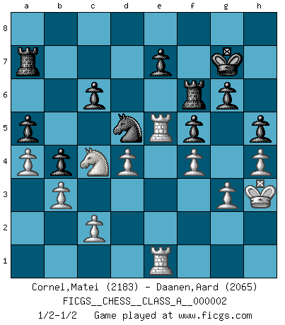 Last move : 1/2-1/2 2006 November 30 17:45:24 [Event "FICGS__CHESS__CLASS_A__000002"] [Site "FICGS"] [Date "2006.04.10"] [Round "1"] [White "Cornel,Matei"] [Black "Daanen,Aard"] [Result "1/2-1/2"] [WhiteElo "2183"] [BlackElo "2065"] 1.e4 d5 2.exd5 Qxd5 3.Nc3 Qd6 4.Nf3 Nf6 5.d4 a6 6.Be3 b5 7.Bd3 Bb7 8.O-O Nbd7 9.Ng5 g6 10.Nce4 Nxe4 11.Bxe4 Bxe4 12.Nxe4 Qd5 13.Qf3 Nb6 14.Rfe1 f5 15.Ng5 Qxf3 16.Nxf3 Bg7 17.Bf4 Nd5 18.Be5 O-O 19.Bxg7 Kxg7 20.Ng5 Rfb8 21.Re5 c6 22.Ne6+ Kf6 23.Rae1 Ra7 24.g3 a5 25.a3 Rd7 26.b3 Ra7 27.Nc5 Kf7 28.Kg2 b4 29.Ra1 R7a8 30.h4 Rd8 31.Ne6 Rdb8 32.a4 h5 33.Ng5+ Kg7 34.Rae1 Ra7 35.Kh3 Rd7 36.Ne6+ Kf7 37.Nc5 Rd6 38.Nd3 Ra8 39.Nb2 Rf6 40.Nc4 Ra7 41.f3 Kg7 42.f4 1/2-1/2 Scandinavian : Pytel-Wade variation Kingside Castling by player White (move 8) Kingside Castling by player Black (move 18) This chess game ended in a draw. Follow this game move after move (download)Examine moves that smite! A good eye for smites is far more important than a knowledge of strategical principles. (Purdy) Ja, ich habe einmal eine Blitzpartie gespielt, es war in einem Zug, 1929. --im Interview 1989 (Mikhail Moiseyevich Botvinik) Si tu oponente te ofrece un empate, trata de averiguar porque piensa él que esta en una posición peor. (Nigel Short) J'ai toujours senti une vague pitié pour l'homme qui ne connaît rien aux échecs, tout comme j'en aurais pour un homme ignorant de l'amour. Les Echecs, comme la musique ou comme l'amour, ont le pouvoir de rendre heureux. (Siegbert Tarrasch) The existence of forgetting has never been proved: We only know that some things don't come to mind when we want them. (Friedrich Nietzsche)