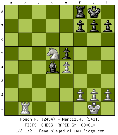 Last move : 1/2-1/2 2021 January 15 22:58:14 [Event "FICGS__CHESS__RAPID_GM__000010"] [Site "FICGS"] [Date "2020.10.31"] [Round "1"] [White "Wosch,Arkadiusz"] [Black "Marciz,Alexander"] [Result "1/2-1/2"] [WhiteElo "2454"] [BlackElo "2431"] 1.e4 c5 2.Nf3 Nc6 3.d4 cxd4 4.Nxd4 Nf6 5.Nc3 e5 6.Ndb5 d6 7.Bg5 a6 8.Na3 b5 9.Nd5 Be7 10.Bxf6 Bxf6 11.c3 Rb8 12.Nc2 Bg5 13.a4 bxa4 14.Ncb4 Nxb4 15.Nxb4 Bd7 16.Bxa6 Qa5 17.Qxd6 Rb6 18.Qd3 Be7 19.Nd5 Rxb2 20.O-O Qc5 21.c4 Rb3 22.Qe2 O-O 23.Bb5 Bxb5 24.cxb5 Bd6 25.b6 Qb5 26.Qxb5 Rxb5 27.Rxa4 Bc5 28.R4a1 Bxb6 29.Rab1 Rxb1 30.Rxb1 Bd4 1/2-1/2 Follow this game move after move (download)Some part of a mistake is always correct. (Savielly Tartakover) Schon mancher Spieler hat aufgegeben, um zu vermeiden, daß er eine Figur verliert. (Savielly Grigorievitsch Tartakower) El Ajedrez se juega con la mente... ¡no con las manos!. (Renaud y Kahn) 'L'échange des dames est un coup dur pour les deux adversaires...' Un journaliste lors d'une partie du match Spassky-Fischer Who needs drugs and alcohol if he can play Big Chess at FICGS ? (Heinz-Georg Lehnhoff)