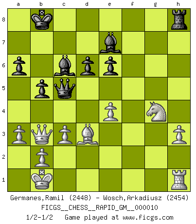 Last move : 1/2-1/2 2021 March 8 19:13:33 [Event "FICGS__CHESS__RAPID_GM__000010"] [Site "FICGS"] [Date "2020.10.31"] [Round "1"] [White "Germanes,Ramil"] [Black "Wosch,Arkadiusz"] [Result "1/2-1/2"] [WhiteElo "2448"] [BlackElo "2454"] 1.e4 c5 2.Nf3 Nc6 3.d4 cxd4 4.Nxd4 Nf6 5.Nc3 d6 6.Bg5 e6 7.Qd2 a6 8.O-O-O Bd7 9.f4 h6 10.Bh4 b5 11.Bxf6 gxf6 12.Kb1 Qb6 13.Nxc6 Bxc6 14.f5 O-O-O 15.fxe6 fxe6 16.Bd3 h5 17.Qe1 Rg8 18.Ne2 Rxg2 19.Nf4 Rf2 20.Rf1 Rxf1 21.Qxf1 Re8 22.Nxh5 Qd4 23.c3 Qe5 24.Nxf6 Rd8 25.Ng4 Qh5 26.Qg2 Be7 27.a3 Rf8 28.h3 Rh8 29.Qc2 Kb8 30.Rh1 Qc5 31.Qb3 1/2-1/2 Follow this game move after move (download)The Chess pieces are the block alphabet which shapes thoughts; and these thoughts, although making a visual design on the chessboard, express their beauty abstractly, like a poem. (Marcel Duchamp) Ja, ich habe einmal eine Blitzpartie gespielt, es war in einem Zug, 1929. --im Interview 1989 (Mikhail Moiseyevich Botvinik) Dejen al perfeccionista jugar por correo. (Yasser Seirawan) Les échecs, c'est l'imagination. (David Bronstein) If we knew what we were doing, we would not call it research. (Albert Einstein)