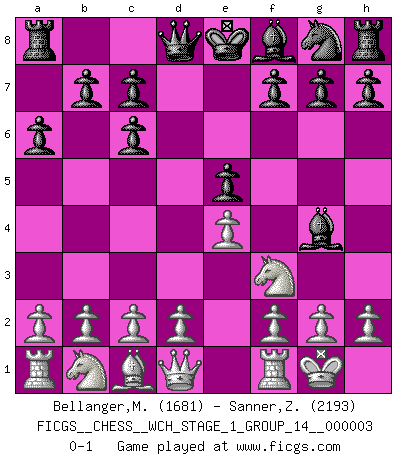 Last move : 0-1 2007 August 26 23:45:37 [Event "FICGS__CHESS__WCH_STAGE_1_GROUP_14__000003"] [Site "FICGS"] [Date "2007.07.11"] [Round "1"] [White "Bellanger,Michel"] [Black "Sanner,Zdzislaw"] [Result "0-1"] [WhiteElo "1681"] [BlackElo "2193"] 1.e4 e5 2.Nf3 Nc6 3.Bb5 a6 4.Bxc6 dxc6 5.O-O Bg4 0-1 This chess game has been lost on time (started : 2007.07.11 17:11:17) Ruy Lopez : Exchange variation, 5.O-O Kingside Castling by player White (move 5) Player Black won this chess game. Follow this game move after move (download)To avoid losing a piece, many a person has lost the game. (Savielly Tartakover) Schach ist das schnellste Spiel der Welt, weil man in jeder Sekunde Tausende von Gedanken ordnen muß. (Albert Einstein) El Ajedrez se juega con la mente... ¡no con las manos!. (Renaud y Kahn) Si le désir cupide (et stupide) de gagner est une inépuisable source de souffrance, une combinaison brillante sur l'échiquier est une découverte : le coquelicot qui s'épanouit lorsque apparaît la Voie Lactée. (Arrabal) It is not true that people stop pursuing dreams because they grow old, they grow old because they stop pursuing dreams. (Gabriel Garcia Marquez)