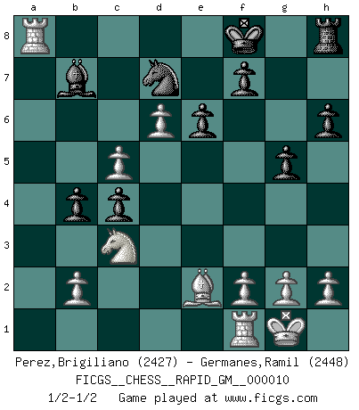 Last move : 1/2-1/2 2020 November 18 10:31:56 [Event "FICGS__CHESS__RAPID_GM__000010"] [Site "FICGS"] [Date "2020.10.31"] [Round "1"] [White "Perez,Brigiliano"] [Black "Germanes,Ramil"] [Result "1/2-1/2"] [WhiteElo "2427"] [BlackElo "2448"] 1.d4 Nf6 2.c4 e6 3.Nf3 d5 4.Nc3 c6 5.Bg5 h6 6.Bh4 dxc4 7.e4 g5 8.Bg3 b5 9.Be2 Bb7 10.O-O Nbd7 11.Ne5 Bg7 12.Nxd7 Nxd7 13.Bd6 a6 14.a4 Bf8 15.Bxf8 Kxf8 16.e5 c5 17.axb5 axb5 18.dxc5 Qc7 19.Qd6+ Qxd6 20.exd6 b4 21.Rxa8+ 1/2-1/2 Follow this game move after move (download)Chess teaches you to control the initial excitement you feel when you see something that looks good and it trains you to think objectively when you're in trouble. (Stanley Kubrick) Ohne ihre Erfolge schmälern zu wollen würde ich sagen Petrosian, Spassky und Karpov verdanken ihre Siege ihren Trainern - Boleslavsky, Bondarevsky und Furman. (Mikhail Moiseyevich Botvinik) El Ajedrez es sobre todo, ¡una pelea!. (Emanuel Lasker) Aucun coup ne doit être joué sans but. (Pedro Damiano) Whenever people agree with me, I always feel I must be wrong. (Oscar Wilde)