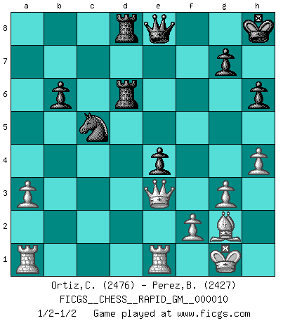 Last move : 1/2-1/2 2021 January 2 19:32:40 [Event "FICGS__CHESS__RAPID_GM__000010"] [Site "FICGS"] [Date "2020.10.31"] [Round "1"] [White "Ortiz,Clodomiro"] [Black "Perez,Brigiliano"] [Result "1/2-1/2"] [WhiteElo "2476"] [BlackElo "2427"] 1.d4 Nf6 2.c4 e6 3.Nc3 Bb4 4.e3 O-O 5.Bd3 d5 6.Nf3 c5 7.cxd5 exd5 8.dxc5 Nbd7 9.Bd2 Nxc5 10.Be2 Ne6 11.a3 Bd6 12.O-O Bd7 13.b4 a6 14.Qb3 Bc6 15.Rfd1 Qe7 16.g3 Rac8 17.Bf1 h6 18.Be1 Rfd8 19.Rab1 Qe8 20.b5 axb5 21.Nxb5 Bc5 22.h4 Nc7 23.Rdc1 b6 24.Nbd4 Ba4 25.Qb2 Bd7 26.Ra1 Ne4 27.Nd2 Nd6 28.N4b3 Ne6 29.Bg2 Bc6 30.Qe5 f6 31.Qb2 Nf7 32.Nd4 Ne5 33.Nxc6 Rxc6 34.Qb3 Rcd6 35.Nf3 Kh8 36.Nxe5 fxe5 37.Bb4 d4 38.Re1 dxe3 39.Bxc5 Nxc5 40.Qxe3 e4 1/2-1/2 Follow this game move after move (download)Many Chess players were surprised when after the game, Fischer quietly explained: 'I had already analyzed this possibility' in a position which I thought was not possible to foresee from the opening. (Mikhail Tal) Die unerbitterlichsten Regeln im Schach sind die Ausnahmen. (Savielly Grigorievitsch Tartakower) El Ajedrez es 99 por ciento táctica. (Teichmann) Le jeu d'échecs est comme rejeté hors du temps. (Antoine de Saint-Exupéry) If you know the enemy and know yourself you need not fear the results of a hundred battles. (Sun Tzu)