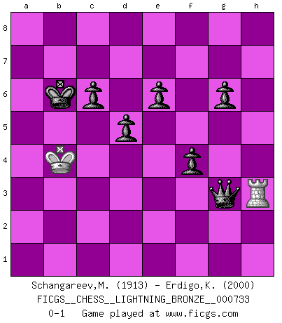 Last move : 0-1 2020 November 1 17:51:41 [Event "FICGS__CHESS__LIGHTNING_BRONZE__000733"] [Site "FICGS"] [Date "2020.11.01"] [Round "1"] [White "Schangareev,Mirzian"] [Black "Erdigo,Kilian"] [Result "0-1"] [WhiteElo "1913"] [BlackElo "2000"] 1.Nc3 d5 2.d4 Nf6 3.Nf3 Bf5 4.e3 e6 5.Nh4 Bg6 6.Be2 Bb4 7.Bd2 Nbd7 8.Nxg6 hxg6 9.O-O c6 10.h3 Bd6 11.a4 Qc7 12.f4 O-O-O 13.Rb1 a6 14.b4 b5 15.Bd3 Nb6 16.Qe2 Nh5 17.Qf2 f5 18.a5 Nc4 19.Bxc4 bxc4 20.Na4 g5 21.Nc5 Bxc5 22.bxc5 g4 23.hxg4 Nf6 24.Qe1 Ne4 25.g5 g6 26.Rf3 Rh5 27.Rh3 Rdh8 28.Bc1 Rxh3 29.gxh3 Rxh3 30.Qb4 Rg3+ 31.Kf1 Nc3 32.Qxc3 Qh7 33.Qe1 Qh3+ 34.Ke2 Rg2+ 35.Qf2 Rxf2+ 36.Kxf2 Qh2+ 37.Kf3 Qxc2 38.Ra1 Qe4+ 39.Kf2 Kd7 40.Bd2 Qc2 41.Ke1 c3 42.Rd1 cxd2 43.Ke2 Qc3 44.Rxd2 Qxa5 45.Rb2 Kc7 46.Rc2 Qb5+ 47.Kd2 a5 48.Kc1 a4 49.Ra2 Qc4+ 50.Kb1 Qb3 51.Rb2 Qxe3 52.Ka2 Qxd4 53.Rh2 Qxc5 54.Rh7+ Kb6 55.Kb2 a3+ 56.Ka2 Qb4 57.Rh2 Qxf4 58.Rh3 Qxg5 59.Kxa3 f4 60.Kb4 Qg3 0-1 Dunst (Sleipner, Heinrichsen) Opening Kingside Castling by player White (move 9) Queenside Castling by player Black (move 12) 10 pieces endgame at move 58 : White KR , Black KQPPPPPP WHITE : King + 1 Rook BLACK : King + 1 Queen 6 Pawns 9 pieces endgame at move 59 : White KR , Black KQPPPPP WHITE : King + 1 Rook BLACK : King + 1 Queen 5 Pawns Player Black won this chess game. Follow this game move after move (download)The passion for playing Chess is one of the most unaccountable in the world. (H.G. Wells) Frage: Was machen Sie mit den Preisen? Anwort: Ich habe Angst, dass meine Freundin davon neue Kleider kauft. (Loek van Wely) El Ajedrez es despiadado: debes de estar preparado para matar gente. (Nigel Short) Mais n'est-ce pas déjà le limiter injurieusement que d'appeler les échecs un jeu? N'est-ce pas aussi une science, un art, ou quelque chose qui, comme le cercueil de Mahomet entre ciel et terre, est suspendu entre l'un et l'autre, et qui réunit un nombre incroyable de contraires ? (Stefan Zweig) Don't anthropomorphize computers - they hate it. (Anonymous)