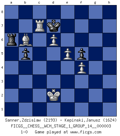 Last move : 1-0 2008 February 13 11:54:59 [Event "FICGS__CHESS__WCH_STAGE_1_GROUP_14__000003"] [Site "FICGS"] [Date "2007.07.11"] [Round "1"] [White "Sanner,Zdzislaw"] [Black "Kepinski,Janusz"] [Result "1-0"] [WhiteElo "2193"] [BlackElo "1624"] 1.e4 e6 2.d3 d6 3.Nf3 Be7 4.g3 Nf6 5.Bg2 e5 6.O-O O-O 7.Re1 Nc6 8.c3 Be6 9.d4 exd4 10.Nxd4 Nxd4 11.cxd4 Re8 12.Nc3 c6 13.b3 d5 14.e5 Nd7 15.a3 Nf8 16.f4 Qd7 17.Bf3 b6 18.Kh1 g6 19.g4 f5 20.g5 Bf7 21.Re2 Ne6 22.Be3 a5 23.h4 Ng7 24.Rh2 Rec8 25.Ne2 a4 26.bxa4 Qa7 27.Nc3 Qa6 28.Qe2 Qxe2 29.Rxe2 Bd8 30.Rb2 Ne6 31.Kg2 Kg7 32.Rc1 Rcb8 33.Kg3 Be7 34.Rcb1 Bd8 35.Rh2 h6 36.Rc2 Be7 37.Rcb2 Bd8 38.Be2 hxg5 39.hxg5 Bc7 40.Bf3 Rh8 41.Rc1 Bd8 42.Na2 Be8 43.Nb4 Rxa4 44.Nxc6 Bxg5 45.Bxd5 Rxa3 46.Rb3 Bh4+ 47.Kf3 Ra2 48.Rbc3 Rh2 49.R1c2 Be1 50.Rxh2 Rxh2 51.Rc1 Bf7 52.Ne7 Kf8 53.Nxg6+ Kg7 54.Bxe6 Bxe6 55.Ne7 Kf7 56.d5 Kxe7 57.d6+ Kd7 58.Rxe1 b5 59.Rc1 Bc4 60.Kg3 Re2 61.Bc5 Rd2 62.Ra1 Ra2 63.Rh1 Kc6 64.Rh8 Be6 65.Rh6 Kd5 66.Kf3 Ra8 67.Ke3 Ra4 68.Bb6 Re4+ 69.Kf3 Bd7 70.Be3 Ra4 71.Rh7 Kc6 72.Rh8 Be6 73.Rb8 Bd5+ 74.Kg3 Ra3 75.Rc8+ Kd7 76.Rc7+ Kd8 77.Kf2 Ra2+ 78.Ke1 Bc4 79.Bb6 Ra1+ 80.Kd2 Ra6 81.Rxc4 Kd7 82.Rc7+ 1-0 French : King's Indian attack Kingside Castling by player White (move 6) Kingside Castling by player Black (move 6) 10 pieces endgame at move 81 : White KRBPPP , Black KRPP WHITE : King + 1 Rook 1 Bishop 3 Pawns BLACK : King + 1 Rook 2 Pawns Player White won this chess game. Follow this game move after move (download)You are for me the Queen on d8 and I am the Pawn on d7 !! (Eduard Gufeld) Schach ist die gewalttätigste aller Sportarten. (Garry Kasparov) El Ajedrez te enseña a controlarl la excitación inicial que sientes cuando vez algo que parece bueno y te enseña a pensar objetivamente cuando te encuentras en problemas. (Stanley Kubrick) Karpov est une pièce de musée. (Garry Kasparov) Luck has a peculiar habit of favoring those who don't depend on it. (Author unknown)
