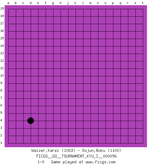 Last move : 1-0 2020 December 3 23:46:11 [Event "FICGS__GO__TOURNAMENT_KYU_I__000096"] [Site "FICGS"] [Date "2020.11.02"] [Round "1"] [Black "Walzer,Karel"] [White "Dojun,Boku"] [Result "1-0"] [Rating 1 "1063"] [Rating 2 "1100"] 1.d4 1-0 This go game has been lost on time (started : 2020.11.02 22:39:54) Follow this game move after move (download)Eyes win semiais. (Anonymous) There are more things in heaven and earth than practically anywhere else. (Unknown)