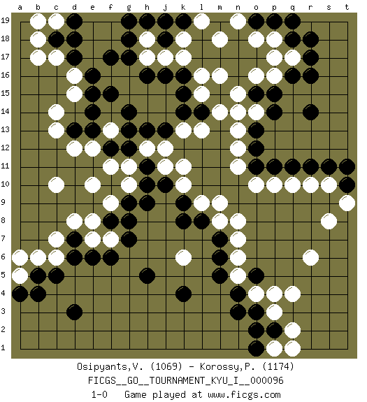 Last move : 1-0 2021 January 18 8:7:28 [Event "FICGS__GO__TOURNAMENT_KYU_I__000096"] [Site "FICGS"] [Date "2020.11.02"] [Round "1"] [Black "Osipyants,Vladimir"] [White "Korossy,Peter"] [Result "1-0"] [Rating 1 "1069"] [Rating 2 "1174"] 1.q16 q4 2.d3 d16 3.c5 c7 4.k4 q10 5.r14 q17 6.r17 p17 7.r18 m16 8.f17 h17 9.f15 c14 10.h16 j17 11.g17 c10 12.o3 o4 13.n4 p3 14.o5 p4 15.n3 r6 16.r11 r10 17.q11 p10 18.f6 k6 19.h5 n5 20.m5 n6 21.m6 n7 22.m7 n8 23.k8 k10 24.j13 j12 25.h13 k13 26.o13 n11 27.o15 o16 28.p15 f13 29.g14 h12 30.k14 l13 31.l14 m14 32.k16 k17 33.j16 l16 34.h9 f9 35.g8 g10 36.d6 e8 37.o19 o18 38.p19 n19 39.q19 m18 40.d18 c17 41.c18 b18 42.d17 b17 43.e16 d15 44.e14 d12 45.e13 e12 46.g12 g11 47.f12 f11 48.g13 n13 49.o12 n12 50.o11 o10 51.s11 s10 52.t10 t9 53.t11 s8 54.p11 l9 55.l8 b6 56.b5 a5 57.a4 a6 58.b4 c6 59.d7 d8 60.f8 e7 61.e6 f7 62.g7 n15 63.k9 m9 64.p2 q2 65.o2 p1 66.h11 j11 67.h10 l15 68.k15 h18 69.g18 b19 70.j10 k11 71.g9 e10 72.o1 q1 73.d13 c13 74.e15 c19 75.d19 o14 76.p14 n14 77.h19 j19 78.g19 p16 79.q18 p18 80.r16 m8 81.k19 k18 82.j18 l19 83.j19 1-0 Follow this game move after move (download)In the corner, five stones in a row on the third line are alive. (Anonymous) Unless in communicating with it one says exactly what one means, trouble is bound to result. (Alan Turing, about computers)