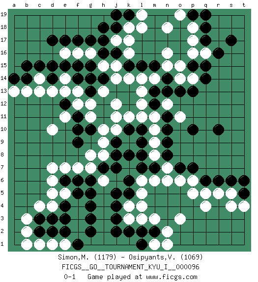 Last move : 0-1 2021 January 9 23:27:7 [Event "FICGS__GO__TOURNAMENT_KYU_I__000096"] [Site "FICGS"] [Date "2020.11.02"] [Round "1"] [Black "Simon,Mickael"] [White "Osipyants,Vladimir"] [Result "0-1"] [Rating 1 "1179"] [Rating 2 "1069"] 1.r16 q4 2.d17 c4 3.e4 d6 4.c15 k16 5.q6 o3 6.c3 b3 7.d3 b2 8.j3 l4 9.j5 r5 10.r10 p17 11.q15 n16 12.h16 d10 13.p10 o14 14.p13 c13 15.r6 f16 16.f17 e16 17.e17 g16 18.g17 h15 19.j16 j15 20.k15 k17 21.h17 k14 22.l15 l14 23.m15 m14 24.e6 d7 25.j8 h10 26.g15 e14 27.k10 n6 28.g14 j14 29.h11 g11 30.g10 j11 31.h12 j10 32.f11 g12 33.g13 f12 34.e12 f13 35.e15 e13 36.d14 d13 37.f15 h13 38.q18 p18 39.q17 p16 40.f9 e11 41.l2 m3 42.m2 n2 43.o7 o6 44.p7 p5 45.s6 s5 46.t5 t4 47.t6 s4 48.p19 o19 49.q19 n18 50.c2 d4 51.e3 e7 52.f6 f7 53.f10 g8 54.h7 h8 55.k8 g7 56.g6 n7 57.n8 l6 58.b14 b13 59.l7 m11 60.j18 k18 61.a14 c14 62.d15 a13 63.b15 k11 64.l10 l11 65.k6 l5 66.o13 o11 67.n13 p14 68.q14 m8 69.n9 m9 70.n10 m10 71.l8 h6 72.j7 e5 73.f5 d5 74.n11 n12 75.m12 l12 76.m13 f4 77.g5 f3 78.g4 f2 79.e2 d1 80.g3 e1 81.g2 c1 82.f1 l13 83.k19 l19 84.j19 l18 85.j9 h9 86.n14 n15 87.p15 o15 88.l9 k3 89.k2 l3 90.h14 j12 91.m7 m6 92.k5 m1 93.j2 j17 94.h18 q16 95.s17 k4 96.l1 n1 97.j4 p6 98.d2 b1 99.f14 q5 100.pass pass 0-1 Follow this game move after move (download)A basic: Don't push too hard. (Jansteen) Happy endings are just stories that haven't finished yet. (Jane Smith in Mr & Mrs Smith)