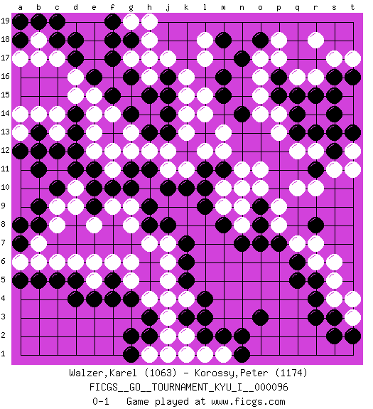Last move : 0-1 2021 April 20 9:40:53 [Event "FICGS__GO__TOURNAMENT_KYU_I__000096"] [Site "FICGS"] [Date "2020.11.02"] [Round "1"] [Black "Walzer,Karel"] [White "Korossy,Peter"] [Result "0-1"] [Rating 1 "1063"] [Rating 2 "1174"] 1.d4 d16 2.r4 q16 3.l3 c6 4.c5 d6 5.g4 d10 6.f17 h17 7.f15 c14 8.h15 k16 9.d12 e14 10.f13 e13 11.e11 e12 12.d11 f12 13.e10 d9 14.g10 h12 15.h13 g13 16.g14 f14 17.d18 c17 18.c18 b18 19.j13 j12 20.g16 g6 21.j10 r10 22.q14 o17 23.r15 r16 24.r11 q10 25.r8 o10 26.l10 k11 27.k10 j6 28.k6 j5 29.k5 r6 30.q5 q7 31.q6 r7 32.p7 p8 33.o7 r12 34.n14 l14 35.g18 h18 36.j15 m13 37.n10 o11 38.m16 l15 39.n17 o16 40.m15 l17 41.o18 p18 42.m18 l18 43.r13 q12 44.s16 s17 45.s15 t17 46.s12 s11 47.s13 p14 48.p15 o14 49.q15 o15 50.s14 f9 51.g11 g12 52.j8 j4 53.h3 j3 54.o3 h7 55.e9 e8 56.c10 c9 57.b11 g9 58.b9 c8 59.b8 b7 60.b13 b14 61.b5 e5 62.e4 s4 63.s3 s5 64.r3 t3 65.t2 t4 66.s2 j2 67.h2 m1 68.m2 l1 69.n2 n9 70.m8 n8 71.n7 m9 72.l9 m10 73.l11 l12 74.m11 n11 75.n1 k2 76.l2 k1 77.f5 f6 78.d5 e6 79.d17 b17 80.e16 d15 81.h8 g8 82.h9 h1 83.g1 j1 84.g2 c13 85.c12 a13 86.b12 j7 87.k7 g17 88.f19 h19 89.j16 j17 90.b19 k4 91.l4 g5 92.f4 k13 93.j14 m12 94.r5 s6 95.o8 p9 96.o9 n10 97.h11 b6 98.a5 t12 99.t13 t11 100.p16 p17 101.q13 p13 102.t16 r18 103.d13 h4 104.a12 a14 105.a7 a6 106.a8 g19 107.f18 j11 108.a18 a17 109.c19 k15 110.d14 e15 111.a19 f11 112.f10 k14 113.k3 h16 0-1 Follow this game move after move (download)The poor player plays the opponent's game for him. (Anonymous) The large trees attract high winds. (Chinese proverb)