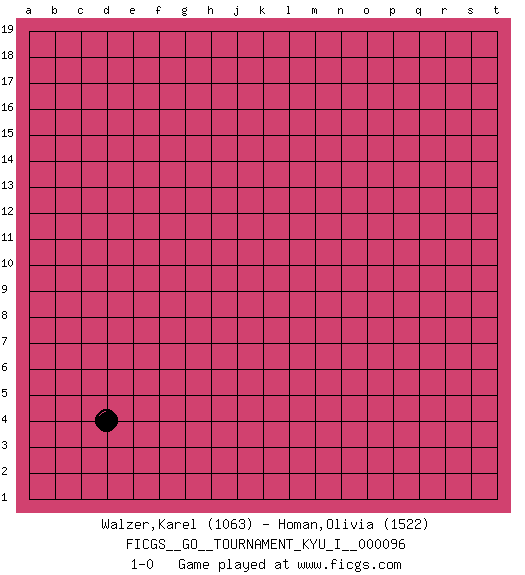Last move : 1-0 2020 December 3 23:46:11 [Event "FICGS__GO__TOURNAMENT_KYU_I__000096"] [Site "FICGS"] [Date "2020.11.02"] [Round "1"] [Black "Walzer,Karel"] [White "Homan,Olivia"] [Result "1-0"] [Rating 1 "1063"] [Rating 2 "1522"] 1.d4 1-0 This go game has been lost on time (started : 2020.11.02 22:39:54) Follow this game move after move (download)Proverbs do not apply to White. (Tero Sand) Coffee just isn't my cup of tea. (Unknown)