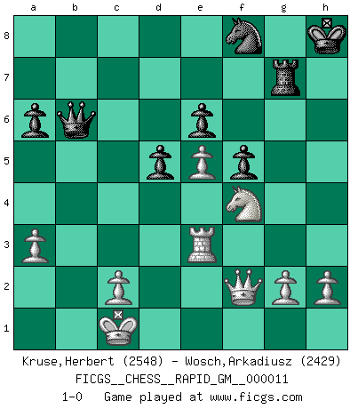 Last move : 1-0 2021 February 7 10:48:44 [Event "FICGS__CHESS__RAPID_GM__000011"] [Site "FICGS"] [Date "2020.11.03"] [Round "1"] [White "Kruse,Herbert"] [Black "Wosch,Arkadiusz"] [Result "1-0"] [WhiteElo "2548"] [BlackElo "2429"] 1.e4 c5 2.Nf3 Nc6 3.d4 cxd4 4.Nxd4 Nf6 5.Nc3 d6 6.Bg5 e6 7.Qd2 a6 8.Nxc6 bxc6 9.O-O-O h6 10.Bf4 d5 11.Qe3 Bb4 12.Be2 O-O 13.e5 Nd7 14.Qg3 Qc7 15.Na4 Re8 16.Bh5 Ra7 17.Rd3 Bf8 18.Re1 Qa5 19.Nc3 Rb7 20.Bxh6 Qb4 21.Qg5 Qe7 22.Qg4 g6 23.Bxf8 Nxf8 24.a3 Kh8 25.Rg3 Nh7 26.Ne2 Rg8 27.Nf4 Bd7 28.Qh3 g5 29.Nd3 c5 30.f4 c4 31.Nf2 f5 32.fxg5 Rxg5 33.Qh4 Bc6 34.Nh3 Rxg3 35.Qxg3 Be8 36.Bxe8 Qxe8 37.Nf4 Qb5 38.b4 cxb3 39.Qxb3 Qc6 40.Qg3 Qb6 41.Re3 Rg7 42.Qf3 Nf8 43.Qf2 1-0 Follow this game move after move (download)A Chess game is divided into three stages: the first, when you hope you have the advantage, the second when you believe you have an advantage, and the third... when you know you're going to lose ! (Savielly Tartakower) Ich kenne Menschen, die allen Willen der Welt besitzen und doch nicht Schach spielen können. (Robert James Fischer) El jugador de combinación piensa hacia adelante; comienza de la posición dada y trabaja las movidas contundentes en su mente. (Emanuel Lasker) Karpov est une pièce de musée. (Garry Kasparov) The greatest con, that he ever pulled... was making you believe... that he is you. (Revolver, movie)