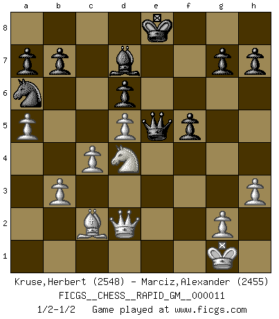 Last move : 1/2-1/2 2020 December 26 15:2:44 [Event "FICGS__CHESS__RAPID_GM__000011"] [Site "FICGS"] [Date "2020.11.03"] [Round "1"] [White "Kruse,Herbert"] [Black "Marciz,Alexander"] [Result "1/2-1/2"] [WhiteElo "2548"] [BlackElo "2455"] 1.Nf3 c5 2.e4 Nc6 3.d4 cxd4 4.Nxd4 Nf6 5.Nc3 e5 6.Ndb5 d6 7.Nd5 Nxd5 8.exd5 Nb8 9.c4 Be7 10.a4 O-O 11.a5 Bd7 12.Nc3 Na6 13.Be2 f5 14.O-O Bg5 15.Bxg5 Qxg5 16.Qc1 Qd8 17.b3 e4 18.Qd2 Qf6 19.Rab1 Rfe8 20.Rfe1 Re7 21.f4 exf3 22.Bxf3 Rxe1+ 23.Rxe1 Re8 24.Rxe8+ Bxe8 25.Ne2 Bd7 26.Nd4 Kf7 27.h3 Qe5 28.Bd1 Ke8 29.Bc2 1/2-1/2 Follow this game move after move (download)Pawns: they are the soul of this game, they alone form the attack and defense. (Philidor) Ein bischen Romantik kann weder im Schach noch in der Liebe schaden. Also versuche ich mich ab und zu daran zu erinnern. (Nigel Short) Los Peones son nacidos libres, y aún así, se encuentran encadenados por todos lados. (Rick Kennedy) Les Echecs représentent une sphère d'idées créatrices basée sur la volonté des deux protagonistes. (Smyslov) Hold em is to stud what chess is to checkers. (Johnny Moss)