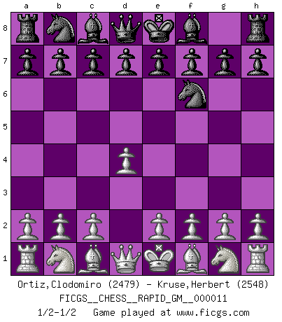 Last move : 1/2-1/2 2020 November 3 13:8:8 [Event "FICGS__CHESS__RAPID_GM__000011"] [Site "FICGS"] [Date "2020.11.03"] [Round "1"] [White "Ortiz,Clodomiro"] [Black "Kruse,Herbert"] [Result "1/2-1/2"] [WhiteElo "2479"] [BlackElo "2548"] 1.d4 Nf6 1/2-1/2 Queen's pawn game This chess game ended in a draw. Follow this game move after move (download)There is only one thing Fischer does in Chess without pleasure: to lose ! (Boris Spassky) Unter Putin wird alles Geld aus Russland wie von einem Staubsauger nach Moskau umgeleitet, das ist wie ein schwarzes Loch. (Garry Kasparov) Cuando tengas duda... ¡juega al Ajedrez!. (Tevis) Les Echecs ont trois composantes : le temps, l'espace et le matériel en dernier. (Mikhail Tal) For a mechanic, you seem to do an excessive amount of thinking. (C-3PO in Star Wars ep.2)