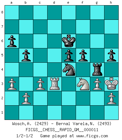 Last move : 1/2-1/2 2021 March 13 13:13:47 [Event "FICGS__CHESS__RAPID_GM__000011"] [Site "FICGS"] [Date "2020.11.03"] [Round "1"] [White "Wosch,Arkadiusz"] [Black "Bernal Varela,Nelson"] [Result "1/2-1/2"] [WhiteElo "2429"] [BlackElo "2493"] 1.e4 e6 2.d4 d5 3.Nc3 Nf6 4.Bg5 dxe4 5.Nxe4 Be7 6.Bxf6 gxf6 7.Nf3 f5 8.Nc3 a6 9.g3 b5 10.Bg2 Bb7 11.O-O c5 12.dxc5 Qxd1 13.Raxd1 Bxc5 14.Rfe1 Ra7 15.a3 O-O 16.Ne5 Be7 17.Ne2 Rc8 18.c3 Bxg2 19.Kxg2 Bf6 20.Nd4 Kf8 21.f4 h5 22.Kh3 Rb7 23.Re3 Bxe5 24.Rxe5 Nd7 25.Re2 Nc5 26.Nf3 Ke7 27.Ne5 f6 28.Ng6+ Kf7 29.Nh4 Ne4 30.Nf3 Ke7 31.Kg2 Rb6 32.Kh3 Rg8 33.Kh4 Rg4+ 34.Kh3 Rd6 35.Rxd6 Kxd6 36.Re3 Ke7 37.Re2 Kd6 38.Re3 e5 39.fxe5+ fxe5 40.Rd3+ Ke6 1/2-1/2 Follow this game move after move (download)Chess, like love, is infectious at any age. (Flohr) Kostenjuk hat keinen Sexappeal. (Loek van Wely) Debió haber existido una vez en que los hombres eran semidióses, de otra manera no hubiesen podido inventar el Ajedrez. (Gustav Schenk) Je fais ceci parce que dans cinquante coups j'obtiendrai cela; je m'appelle Mikhail Moisevitch Botvinnik. (Botvinnik) Plans are ideas that never come to fruition. (Daniel Parmet)