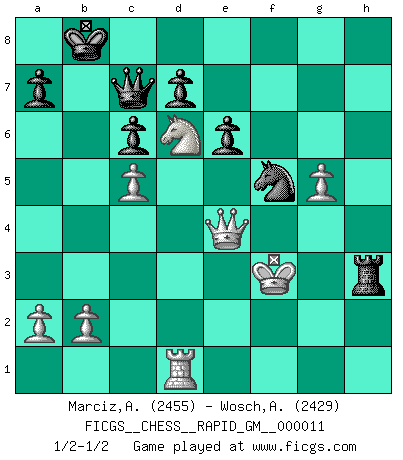 Last move : 1/2-1/2 2021 February 5 19:32:17 [Event "FICGS__CHESS__RAPID_GM__000011"] [Site "FICGS"] [Date "2020.11.03"] [Round "1"] [White "Marciz,Alexander"] [Black "Wosch,Arkadiusz"] [Result "1/2-1/2"] [WhiteElo "2455"] [BlackElo "2429"] 1.e4 c5 2.Nf3 Nc6 3.Nc3 e6 4.d4 cxd4 5.Nxd4 Nf6 6.Nxc6 bxc6 7.e5 Nd5 8.Ne4 Qc7 9.f4 Qb6 10.c4 Bb4+ 11.Ke2 f5 12.Nf2 Ba6 13.Kf3 Ne7 14.Be3 Bc5 15.Bxc5 Qxc5 16.Qd6 Qb6 17.Be2 g5 18.fxg5 Ng6 19.g3 h6 20.h4 Qa5 21.Kg2 Qxe5 22.Qd2 hxg5 23.hxg5 O-O-O 24.Rxh8 Rxh8 25.Rd1 Qc7 26.c5 Bxe2 27.Qxe2 f4 28.Ne4 fxg3 29.Nd6+ Kb8 30.Qe4 Nh4+ 31.Kxg3 Nf5+ 32.Kf3 Rh3+ 33.Kf2 Rh2+ 34.Kf3 Rh3+ 35.Kf2 Rh2+ 36.Kf3 Rh3+ 1/2-1/2 Follow this game move after move (download)Chess is everything: art, science and sport. (Anatoly Karpov) Ich war schon mal beim Dopingtest. Da musste ich Urin abgeben, während Dritte zusahen. (Elisabeth Pähtz) El juego de Fischer siempre fue nítido, racional y brillante. Uno de los mejores por siempre. (Dave Regis) A chaque perte on perd un peu de soi. (Joël Lautier) After growing wildly for years, the field of computing appears to be reaching its infancy. (John Pierce)