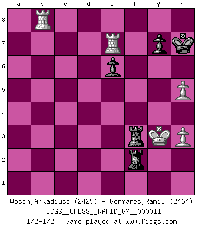 Last move : 1/2-1/2 2021 March 13 13:58:12 [Event "FICGS__CHESS__RAPID_GM__000011"] [Site "FICGS"] [Date "2020.11.03"] [Round "1"] [White "Wosch,Arkadiusz"] [Black "Germanes,Ramil"] [Result "1/2-1/2"] [WhiteElo "2429"] [BlackElo "2464"] 1.e4 e5 2.Nf3 Nc6 3.Bc4 Bc5 4.c3 Nf6 5.d3 d6 6.O-O O-O 7.h3 a5 8.Re1 h6 9.Nbd2 Be6 10.Bxe6 fxe6 11.Nb3 Bb6 12.Be3 Bxe3 13.Rxe3 a4 14.Nbd2 d5 15.d4 a3 16.Nxe5 Nxe5 17.dxe5 axb2 18.Rb1 Nxe4 19.Nxe4 dxe4 20.Qxd8 Rfxd8 21.Rxb2 Rd1+ 22.Kh2 Rd3 23.Rxe4 Rxc3 24.Rxb7 Rxa2 25.Rb8+ Kh7 26.Rf4 Rc5 27.g4 Rxe5 28.Rf7 R5e2 29.Kg3 Ra3+ 30.Kg2 h5 31.gxh5 Ra5 32.Rxc7 Rf5 33.Kg3 Rexf2 34.Re7 R5f3+ 1/2-1/2 Follow this game move after move (download)Though most people love to look at the games of the great attacking masters, some of the most successful players in history have been the quiet positional players. They slowly grind you down by taking away your space, tying up your pieces, and leaving you with virtually nothing to do ! (Yasser Seirawan) Ein Buch ist ein Spiegel; wenn ein Affe hineinsieht, so kann kein Apostel heraus gucken. (Georg Christoph Lichtenberg) Cada Peón es una Reina en potencia. (James Mason) Comme les marins qui ont mille raisons différentes d'aller en mer, les joueurs d'échecs en ont tout autant avant de s'installer devant une table et jouer... (Vincent Bertignac, philosophe) The problem with manipulation is that people can turn on you. (Horatio Caine, C.S.I. Miami)