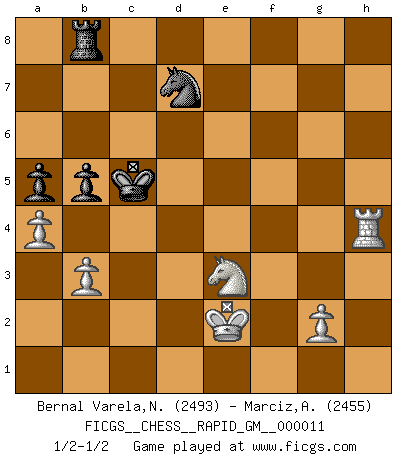 Last move : 1/2-1/2 2021 January 18 6:41:48 [Event "FICGS__CHESS__RAPID_GM__000011"] [Site "FICGS"] [Date "2020.11.03"] [Round "1"] [White "Bernal Varela,Nelson"] [Black "Marciz,Alexander"] [Result "1/2-1/2"] [WhiteElo "2493"] [BlackElo "2455"] 1.Nf3 c5 2.e4 Nc6 3.d4 cxd4 4.Nxd4 Nf6 5.Nc3 e5 6.Ndb5 d6 7.Nd5 Nxd5 8.exd5 Nb8 9.a4 Be7 10.Be2 O-O 11.O-O Nd7 12.Bd2 a6 13.Na3 a5 14.Bb5 Nb6 15.Be3 Bg5 16.f4 Bxf4 17.Bxf4 exf4 18.Rxf4 Qg5 19.Rd4 Qe3+ 20.Kh1 Bd7 21.Qg1 Qg5 22.Qf2 Rae8 23.Bxd7 Nxd7 24.Nc4 Qh5 25.Qg3 Re2 26.Nxd6 Rxc2 27.Re1 Re2 28.Kg1 b6 29.h3 f5 30.Rxe2 Qxe2 31.Qf2 Qxf2+ 32.Kxf2 g6 33.Ke3 Rd8 34.Nc4 Re8+ 35.Kf2 Kg7 36.d6 Kf7 37.b3 g5 38.h4 h6 39.Rd5 Kf6 40.Rb5 Rb8 41.Ne3 gxh4 42.Rxf5+ Ke6 43.Rh5 Kxd6 44.Rxh6+ Kc5 45.Rxh4 b5 46.Ke2 1/2-1/2 Follow this game move after move (download)When you absolutely don't know what to do anymore, it is time to panic. (John van der Wiel) Ich tröste mich mit dem Vergnügen, daß Schachfans, Zuschauer und Leser glücklich sind, wenn ein Großmeister etwas riskiert, statt nur Klötzchen zu schieben. (Mikhail Nekhemyevich Tal) Un jugador que trata de regresar una movida en el Ajedrez es un futuro carterista. (Richard Fenton) Si le désir cupide (et stupide) de gagner est une inépuisable source de souffrance, une combinaison brillante sur l'échiquier est une découverte : le coquelicot qui s'épanouit lorsque apparaît la Voie Lactée. (Arrabal) Man with more than one clock never knows what time it is. (Chinese thought)