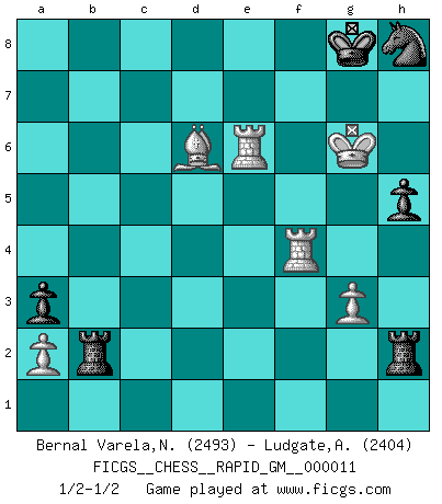 Last move : 1/2-1/2 2021 February 16 14:31:45 [Event "FICGS__CHESS__RAPID_GM__000011"] [Site "FICGS"] [Date "2020.11.03"] [Round "1"] [White "Bernal Varela,Nelson"] [Black "Ludgate,Alan"] [Result "1/2-1/2"] [WhiteElo "2493"] [BlackElo "2404"] 1.Nf3 Nf6 2.d4 g6 3.c4 Bg7 4.Nc3 O-O 5.e4 d6 6.Be2 e5 7.O-O exd4 8.Nxd4 Re8 9.f3 Nc6 10.Be3 Nh5 11.Qd2 Nf4 12.Bxf4 Nxd4 13.Bd3 Ne6 14.Be3 b6 15.Rad1 Bb7 16.Bc2 Nc5 17.Bb1 a5 18.b3 Qf6 19.Rc1 Ne6 20.g3 Qe7 21.Kg2 Bxc3 22.Qxc3 h5 23.Rce1 f6 24.Kg1 Qg7 25.Bc2 f5 26.Qxg7+ Nxg7 27.Bg5 Ne6 28.Be3 fxe4 29.fxe4 Nc5 30.e5 Be4 31.Bxe4 Nxe4 32.Bxb6 Nd2 33.Rf2 Nxc4 34.Bxc7 Nxe5 35.R1e2 Re6 36.Kg2 Ra6 37.Rf4 Re7 38.Bd8 Re8 39.Bg5 a4 40.b4 Rc8 41.Rd4 a3 42.Be7 Nc4 43.Bf6 Ne5 44.Be7 Nc4 45.Kh3 Rb6 46.Rf4 Rxb4 47.Re6 Kh7 48.Rf7+ Kg8 49.R7f6 Rb2 50.Rxg6+ Kf7 51.Rgf6+ Kg8 52.Rf4 Ne5 53.Bxd6 R8c2 54.Kh4 Rxh2+ 55.Kg5 Nf7+ 56.Kg6 Nh8+ 57.Kh6 Nf7+ 58.Kg6 Nh8+ 59.Kh6 Nf7+ 60.Kg6 Nh8+ 1/2-1/2 Follow this game move after move (download)I'd rather have a Pawn than a finger. (Reuben Fine) Das Schach ist nichts für kleine Geister, es beansprucht einen vollen Mann, der sich nicht sklavisch an das Überlieferte hält, sondern selbständig die Tiefen des Spiels zu ergründen sucht. (Wilhelm Steinitz) Nunca antes ha habido un jugador de Ajedrez con tal conocimiento a fondo de las complejidades del juego y una inmensa voluntad absolutamente indomable de ganar. Yo pienso que Fischer es el jugador mas grande que jamás haya existido. (Lisa Lane) J'apprécie les joueurs d'est-indienne, c'est grâce à eux que je nourris ma famille depuis tant d'années. (Petrosian) I just play for fun. (Anna Kournikova)
