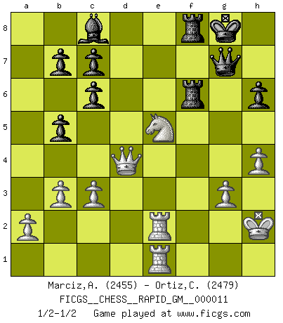 Last move : 1/2-1/2 2020 November 30 15:32:35 [Event "FICGS__CHESS__RAPID_GM__000011"] [Site "FICGS"] [Date "2020.11.03"] [Round "1"] [White "Marciz,Alexander"] [Black "Ortiz,Clodomiro"] [Result "1/2-1/2"] [WhiteElo "2455"] [BlackElo "2479"] 1.e4 e5 2.Nf3 Nc6 3.Bb5 Nf6 4.d3 Bc5 5.Bxc6 dxc6 6.Nbd2 Be6 7.O-O Bd6 8.d4 Nd7 9.dxe5 Nxe5 10.Nxe5 Bxe5 11.f4 Bd4+ 12.Kh1 f5 13.Qh5+ g6 14.Qe2 Qf6 15.c3 Bb6 16.exf5 Qxf5 17.Re1 Kf7 18.Nf3 Rhe8 19.Be3 Rad8 20.b3 Bc8 21.Ne5+ Kg8 22.Bxb6 axb6 23.Rf1 g5 24.Rae1 gxf4 25.g3 Qf6 26.Rxf4 Qg7 27.Kg2 Re7 28.Re4 Rde8 29.Qh5 Rf8 30.h4 Bf5 31.R4e3 h6 32.Qd1 Rfe8 33.Qd4 Re6 34.Qf4 Rf8 35.Kh2 Ref6 36.Qd4 b5 37.R3e2 Bc8 1/2-1/2 Follow this game move after move (download)The older I grow, the more I value Pawns. (Keres) Die jungen Leute sollen verstehen, dass sie noch etwas von mir lernen können und müssen. (Viktor Kortschnoi) ¿Esta Bobby Fischer algo cuerdo?. (Salo Flohr) Les pièces de l'échiquier étaient impitoyables. Elles le retenaient, elles l'absorbaient. Il y avait de l'horreur en cela, mais aussi une harmonie unique. Car, qu'y a-t-il dans le monde, à part les échecs ? (V. Nabokov) The general who wins the battle makes many calculations in his temple before the battle is fought. The general who loses makes but few calculations beforehand. (Sun Tzu)