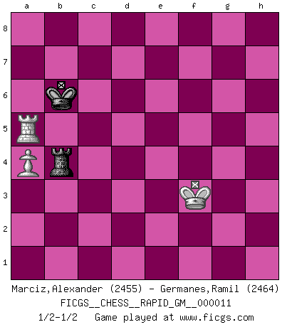 Last move : 1/2-1/2 2021 January 19 12:15:59 [Event "FICGS__CHESS__RAPID_GM__000011"] [Site "FICGS"] [Date "2020.11.03"] [Round "1"] [White "Marciz,Alexander"] [Black "Germanes,Ramil"] [Result "1/2-1/2"] [WhiteElo "2455"] [BlackElo "2464"] 1.d4 Nf6 2.c4 e6 3.g3 Bb4+ 4.Bd2 Be7 5.Bg2 d5 6.Nf3 O-O 7.O-O c6 8.Qc2 b6 9.Ne5 Bb7 10.a3 Nbd7 11.cxd5 cxd5 12.Nc6 Bxc6 13.Qxc6 Rc8 14.Qb5 Ne8 15.e3 Ndf6 16.Rd1 Nd6 17.Qe2 Rc2 18.Qd3 Rc7 19.Nc3 Nc4 20.Bc1 Qd7 21.b3 Na5 22.Rb1 Rfc8 23.Bd2 h6 24.h4 Bf8 25.Be1 Be7 26.Bf1 Bf8 27.Be2 Be7 28.Bf3 Bf8 29.Nb5 Rc6 30.a4 g6 31.Bg2 h5 32.Bf3 Kg7 33.e4 dxe4 34.Bxe4 Nxe4 35.Qxe4 a6 36.b4 Nb7 37.d5 exd5 38.Rxd5 Qe6 39.Nc3 Qxe4 40.Nxe4 Rc1 41.Rd1 Rxb1 42.Rxb1 Rc4 43.f3 Be7 44.Kf1 Kf8 45.Ke2 Ke8 46.Ra1 Kd7 47.Kd3 Rc8 48.Bc3 Rc7 49.g4 hxg4 50.fxg4 Bxh4 51.Rf1 Ke6 52.Bf6 Rd7+ 53.Ke3 Bxf6 54.Rxf6+ Kd5 55.Rxb6 Re7 56.Kf3 Rxe4 57.Rxb7 f5 58.gxf5 gxf5 59.Rb6 a5 60.Rb5+ Kc6 61.Rxf5 Rxb4 62.Rxa5 Kb6 1/2-1/2 Follow this game move after move (download)Not only will I predict his triumph over Botvinnik, but I'll go further and say that he'll probably be the greatest Chess player that ever lived. (John Collins) Kann Schach nicht schließlich das Nationalspiel der Deutschen werden? Und welche weiteren Ausblicke bieten sich dann dar! Welche Hebung des allgemeinen Kultur-Niveaus, ja der Moral, wenn das Schachbrett den Kartentisch verdrängen würde! Wahrlich, ein Ziel, des Schweißes der Edlen wert! (Siegbert Tarrasch) No es una movida, aún la mejor movida que tu debas buscar, sino un plan comprensible. (Eugene Znosko-Borovsky) Il s'avisa de me proposer d'apprendre les échecs qu'il jouait un peu... me voilà forcené des échecs. J'achète un échiquier, je m'enferme dans ma chambre, j'y passe des jours et des nuits à vouloir apprendre par cur toutes les parties. (Jean-Jacques Rousseau, Confessions) The only difference between a tax man and a taxidermist is that the taxidermist leaves the skin. (Mark Twain)