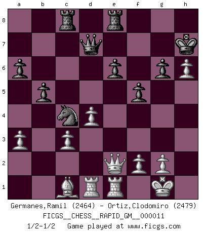 Last move : 1/2-1/2 2021 January 10 13:9:45 [Event "FICGS__CHESS__RAPID_GM__000011"] [Site "FICGS"] [Date "2020.11.03"] [Round "1"] [White "Germanes,Ramil"] [Black "Ortiz,Clodomiro"] [Result "1/2-1/2"] [WhiteElo "2464"] [BlackElo "2479"] 1.d4 d5 2.c4 dxc4 3.Nf3 e6 4.e3 c5 5.Bxc4 Nf6 6.O-O Nc6 7.a3 cxd4 8.exd4 Bd6 9.Nc3 O-O 10.Bg5 Be7 11.Qd3 Nd5 12.Bd2 Nxc3 13.bxc3 b6 14.Ba2 Bb7 15.Rae1 Rc8 16.Re3 Bf6 17.h4 Na5 18.Ng5 Bxg5 19.hxg5 Bd5 20.Rh3 g6 21.Bxd5 Qxd5 22.Rh4 Nc4 23.Bc1 b5 24.Re1 h5 25.gxh6 Kh7 26.Rg4 Qd7 27.Rg3 a6 28.Qf3 f5 29.Qe2 Rfe8 30.Rd3 Qc7 31.R3d1 Qd7 1/2-1/2 Follow this game move after move (download)I prefer to lose a really good game than to win a bad one. (David Levy) Schach ist Krieg, im Schach geht es um testosterongesteuerte Urschreie. (Garry Kasparov) No puedes jugar al Ajedrez si eres de corazón noble. (Proverbio Francés) Les Echecs sont affaire de jugement sensible. Savoir quand frapper et quand esquiver. (Fischer) Panic is a sudden desertion of us, an a going over to the enemy of our imagination. (Christian Nevell Bovee)