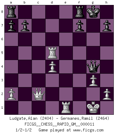 Last move : 1/2-1/2 2020 December 2 0:24:38 [Event "FICGS__CHESS__RAPID_GM__000011"] [Site "FICGS"] [Date "2020.11.03"] [Round "1"] [White "Ludgate,Alan"] [Black "Germanes,Ramil"] [Result "1/2-1/2"] [WhiteElo "2404"] [BlackElo "2464"] 1.d4 Nf6 2.c4 e6 3.Nc3 Bb4 4.Qc2 O-O 5.e4 d5 6.e5 Ne4 7.Bd3 c5 8.Nge2 cxd4 9.Nxd4 Nd7 10.Bf4 Qh4 11.g3 Qh5 12.O-O g5 13.cxd5 Bxc3 14.bxc3 exd5 15.Be3 Nxe5 16.f3 Nc5 17.Bf5 Ne6 18.Rae1 Nxd4 19.Bxd4 Nc6 20.f4 gxf4 21.Rxf4 Nxd4 22.cxd4 Bxf5 23.Rxf5 Qg4 24.Rxd5 1/2-1/2 Follow this game move after move (download)A big shock; the best chess player in history has passed away. (Lajos Portisch, about Bobby Fischer's death) In Buenos Aires ist es nicht mein vorrangiges Ziel ein starkes Turnier zu organisieren, sondern ein Turnier für Gentlemen. Ich würde nie Kamsky einladen. Ich mag keine Probleme. (Miguel Najdorf) La maestría del Ajedrez consiste esencialmente en analizar posiciónes de Ajedrez con precisión. (Mikhail Botvinnik) La tactique, c'est ce que vous faites quand il y a quelque chose à faire; la stratégie, c'est ce que vous faites quand il n'y a rien à faire. (Savielli Tartacower) If you are good, you will be assigned all the work. If you are really good, you will get out of it. (Dan Rotaru)