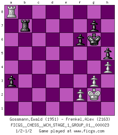 Last move : 1/2-1/2 2020 December 18 18:53:56 [Event "FICGS__CHESS__WCH_STAGE_1_GROUP_01__000023"] [Site "FICGS"] [Date "2020.11.05"] [Round "1"] [White "Gossmann,Ewald"] [Black "Frenkel,Alex"] [Result "1/2-1/2"] [WhiteElo "1951"] [BlackElo "2163"] 1.e4 e5 2.Nf3 Nc6 3.Bc4 Nf6 4.d3 Bc5 5.c3 d6 6.O-O a5 7.Re1 O-O 8.h3 h6 9.a4 Be6 10.Nbd2 Bxc4 11.Nxc4 Re8 12.Be3 Bxe3 13.Nxe3 Qd7 14.Qc2 b6 15.Rab1 Ne7 16.b3 Ng6 17.c4 Nf4 18.Rbd1 c6 19.Qd2 Qe6 20.Kh2 Ng6 21.g3 Rad8 22.Qb2 Nf8 23.Qc2 Ng6 24.Qc3 Rc8 25.Qd2 Rcd8 26.Qc3 Rd7 27.Kg2 d5 28.exd5 cxd5 29.d4 e4 30.Ne5 Nxe5 31.dxe5 Qxe5 32.Qxe5 Rxe5 33.cxd5 Nxd5 34.Rxd5 R7xd5 35.Nxd5 Rxd5 36.Rxe4 Rd3 37.b4 Ra3 38.b5 Kh7 39.Rf4 f6 40.Rd4 h5 41.Rd6 Rxa4 42.Rxb6 Rb4 43.Rb8 a4 44.b6 Kg6 45.b7 Rb3 46.h4 a3 47.Ra8 Rxb7 1/2-1/2 Two knights defense (Modern Bishop's Opening) Kingside Castling by player White (move 6) Kingside Castling by player Black (move 7) This chess game ended in a draw. Follow this game move after move (download)Chess is in its essence a game, in its form an art, and in its execution a science. (Baron Tassilo) Gewinnen beim Schach fördert das Selbstvertrauen. Beim Sex spüre ich sowas nicht... (Garry Kasparov) La caracteristica mas importante en la posición del Ajedrez es la actividad de las piezas. Esto es absolutamente fundamental en todas las fases del juego: Apertura, Juego Medio y especialmente Finales. La limitación primordial en la actividad de una pieza, es la estructuración de los Peones. (Michael Stean) La vérité est comme le meilleur coup aux échecs : elle existe, mais il faut la chercher. (Arturo Perez-Reverte) Creativity is allowing yourself to make mistakes. Art is knowing which ones to keep. (Scott Adams)