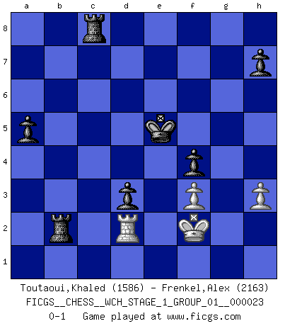 Last move : 0-1 2021 January 29 13:11:48 [Event "FICGS__CHESS__WCH_STAGE_1_GROUP_01__000023"] [Site "FICGS"] [Date "2020.11.05"] [Round "1"] [White "Toutaoui,Khaled"] [Black "Frenkel,Alex"] [Result "0-1"] [WhiteElo "1586"] [BlackElo "2163"] 1.e4 e5 2.Nf3 Nc6 3.d4 exd4 4.Nxd4 Bc5 5.Be3 Qf6 6.c3 Nge7 7.Bc4 Ne5 8.Bb3 Qg6 9.O-O d5 10.f3 O-O 11.Nd2 Bb6 12.exd5 Rd8 13.Bc2 Bf5 14.Bxf5 Nxf5 15.Nxf5 Qxf5 16.Bxb6 axb6 17.c4 Qf4 18.Qc2 Qd4+ 19.Kh1 c6 20.b3 cxd5 21.cxd5 Rxd5 22.Ne4 Nd3 23.Nf2 Qc5 24.Qxc5 bxc5 25.Ne4 Rd4 26.h3 g6 27.Kh2 Rad8 28.a3 f5 29.Nc3 Nf4 30.Ra2 Rd3 31.Rc2 Kf7 32.R1f2 b6 33.a4 Kf6 34.g4 Ne6 35.a5 bxa5 36.Na4 Rc8 37.gxf5 gxf5 38.Rfd2 Rxb3 39.Rd6 Ke5 40.Rcd2 Nd4 41.R6xd4 cxd4 42.Kg3 f4+ 43.Kf2 d3 44.Nb2 Rxb2 0-1 Scotch game Kingside Castling by player White (move 9) Kingside Castling by player Black (move 10) Player Black won this chess game. Follow this game move after move (download)The way he plays Chess demonstrates a man's whole nature. (Stanley Ellin) Man braucht nicht immer den besten Zug zu spielen: Ein Zug muß aktiv, unternehmungslustig, korrekt und schön sein. (David Bronstein) El Ajedrez, como la música, como el amor, tiene el poder de hacer feliz a la gente. (Siegbert Tarrasch) Aux échecs, l'amour-propre est satisfait quand on remporte la victoire, mais il n'y a pas de honte à être battu. (Benjamin Franklin) He who fights with monsters should be careful lest he thereby become a monster. (Friedrich Nietzsche, Beyond Good and Evil)