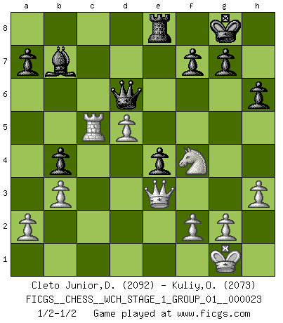 Last move : 1/2-1/2 2021 January 10 18:6:24 [Event "FICGS__CHESS__WCH_STAGE_1_GROUP_01__000023"] [Site "FICGS"] [Date "2020.11.05"] [Round "1"] [White "Cleto Junior,Dirceu"] [Black "Kuliy,Oleksandr"] [Result "1/2-1/2"] [WhiteElo "2092"] [BlackElo "2073"] 1.d4 d5 2.c4 e6 3.Nf3 Nf6 4.Nc3 Be7 5.Bf4 O-O 6.e3 b6 7.Bd3 Bb7 8.cxd5 exd5 9.O-O c5 10.Ne5 Nc6 11.Qf3 Qc8 12.Bg5 cxd4 13.Nxc6 Bxc6 14.exd4 Re8 15.Rae1 h6 16.Bh4 Qd7 17.Bf5 Qb7 18.Bd3 Qd7 19.Bf5 Qb7 20.Re5 Bd8 21.Rd1 b5 22.Ne2 Ne4 23.Bxd8 Raxd8 24.h3 Bd7 25.Bxe4 dxe4 26.Qe3 b4 27.Ng3 Qa6 28.Nh5 Ba4 29.Rxe8+ Rxe8 30.b3 Bd7 31.Rc1 Qd6 32.Rc5 Bc6 33.Nf4 Bb7 34.d5 1/2-1/2 Queen's gambit declined Kingside Castling by player Black (move 5) Kingside Castling by player White (move 9) This chess game ended in a draw. Follow this game move after move (download)Look at Garry Kasparov. After he loses, invariably he wins the next game. He just kills the next guy. That's something that we have to learn to be able to do. (Maurice Ashley) Deine Wertungszahl - vorausgesetzt einige Jahre schachliche Anstrengung - entspricht etwa dem zehnfachen Deines IQ plus 1000. (Jonathan Levitt) La enorme capacidad mental, en la que sin ella no puede un jugador de Ajedrez existir, es demasiado requerida por el Ajedrez al grado de que nunca podrá liberar su mente de este juego. (Albert Einstein) Horreur, mais aussi harmonie suprême : qu'y avait-il en effet au monde en dehors des échecs ? Le brouillard, l'inconnu, le non-être... (Vladimir Nabokov) War is the child of passion, passion is the child of narcissism and narcissism is the child. (...) Another game ? (Thibault de Vassal)