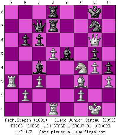 Last move : 1/2-1/2 2021 March 13 2:7:1 [Event "FICGS__CHESS__WCH_STAGE_1_GROUP_01__000023"] [Site "FICGS"] [Date "2020.11.05"] [Round "1"] [White "Pech,Stepan"] [Black "Cleto Junior,Dirceu"] [Result "1/2-1/2"] [WhiteElo "1831"] [BlackElo "2092"] 1.e4 d6 2.d4 Nf6 3.Nc3 g6 4.Nf3 Bg7 5.Be2 c6 6.O-O O-O 7.a4 Nbd7 8.h3 Qc7 9.a5 e5 10.dxe5 Nxe5 11.Be3 Nxf3+ 12.Bxf3 Be6 13.Bf4 Rfd8 14.Qd2 Ne8 15.Bg5 Rd7 16.Rfd1 Rb8 17.Qe3 b5 18.axb6 axb6 19.Rab1 h5 20.Bh6 Be5 21.Ne2 Ba2 22.Ra1 Bc4 23.c3 Rbd8 24.Nf4 Ng7 25.g4 h4 26.Ra3 d5 27.exd5 Kh7 28.Bg5 f6 29.Qe4 fxg5 30.Qxg6+ Kg8 1/2-1/2 Pirc : Classical system, 5.Be2 Kingside Castling by player White (move 6) Kingside Castling by player Black (move 6) This chess game ended in a draw. Follow this game move after move (download)When you see a good move, look for a better one. (Emanuel Lasker) Mutter, ich bin eben Ex-Weltmeister geworden. --beim nach Hause Kommen nach dem Verlust des WM-Titels an Mihail Botvinnik -- (Mikhail Nekhemyevich Tal) Es el objetivo de la escuela moderna no tratar cada posición de acuerdo a una regla general, sino de acuerdo al principio inherente en la posición. (Richard Reti) On est toujours la mazette de quelqu'un d'autre. (Anonyme) Remember : Your focus determines your reality. (Qui-Gon Jinn in Star Wars ep.1)