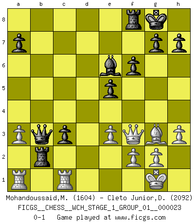 Last move : 0-1 2021 January 28 17:43:41 [Event "FICGS__CHESS__WCH_STAGE_1_GROUP_01__000023"] [Site "FICGS"] [Date "2020.11.05"] [Round "1"] [White "Mohandoussaid,Malik"] [Black "Cleto Junior,Dirceu"] [Result "0-1"] [WhiteElo "1604"] [BlackElo "2092"] 1.Nf3 d5 2.d4 Nf6 3.Bf4 c5 4.c4 cxd4 5.Nxd4 Nbd7 6.cxd5 Nxd5 7.Bg3 e5 8.Nc2 Bb4+ 9.Nxb4 Nxb4 10.a3 Nc6 11.e3 O-O 12.Nc3 Nb6 13.Qh5 Be6 14.Bb5 f6 15.O-O Qd2 16.Rab1 Rad8 17.Rfd1 Qc2 18.Bxc6 bxc6 19.Rdc1 Qb3 20.Ne4 Na4 21.Nc5 Nxc5 22.Rxc5 Rd2 23.R5c1 c5 24.h3 c4 25.Qf3 Rxb2 26.Ra1 c3 0-1 This chess game has been lost on time (started : 2020.11.05 12:58:20) Reti Opening Kingside Castling by player Black (move 11) Kingside Castling by player White (move 15) Player Black won this chess game. Follow this game move after move (download)One doesn't have to play well, it's enough to play better than your opponent. (Siegbert Tarrasch) Dieses schreckliche Gefühl, dass ich gegen eine Maschine spielte, die niemals Fehler macht, zerschmetterte meinen Widerstand. (Mark Taimanov) El ganar no lo es todo... pero el perder es nada. (Mednis) Votre seul travail dans les ouvertures est d'obtenir un milieu de partie jouable. (Lajos Portish) Unless in communicating with it one says exactly what one means, trouble is bound to result. (Alan Turing, about computers)