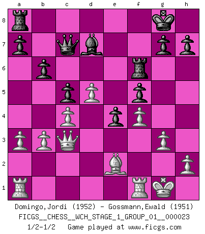 Last move : 1/2-1/2 2021 January 8 18:12:58 [Event "FICGS__CHESS__WCH_STAGE_1_GROUP_01__000023"] [Site "FICGS"] [Date "2020.11.05"] [Round "1"] [White "Domingo,Jordi"] [Black "Gossmann,Ewald"] [Result "1/2-1/2"] [WhiteElo "1952"] [BlackElo "1951"] 1.e4 e5 2.Nf3 Nf6 3.Nxe5 d6 4.Nf3 Nxe4 5.d4 d5 6.Bd3 Be7 7.O-O Nc6 8.c4 Nb4 9.Be2 O-O 10.Nc3 Be6 11.Ne5 c5 12.Nxe4 dxe4 13.d5 Bc8 14.a3 Na6 15.Qc2 f6 16.Ng4 f5 17.Ne5 Nb8 18.f4 Qc7 19.b3 Nd7 20.Bb2 Bf6 21.Nxd7 Bxd7 22.Bxf6 Rxf6 23.Qc3 b6 24.g3 1/2-1/2 Petrov : Classical attack Kingside Castling by player White (move 7) Kingside Castling by player Black (move 9) This chess game ended in a draw. Follow this game move after move (download)In order to improve your game, you must study the endgame before everything else, for whereas the endings can be studied and mastered by themselves, the middle game and the opening must be studied in relation to the endgame. (Jose Raul Capablanca) Sicherlich können nur Meister einen Stil haben. Daß ein nicht-Meister auch nur ein einziges Mal in seinem Leben eine Partie folgerecht durchführte, habe ich niemals bemerkt. (Emanuel Lasker) Los problemas de Ajedrez exigen del compositor las mismas virtudes que caracterizan todo el arte de valor: originalidad, invención, concisión, armonía, complejidad e insinceridad explendida. (Vladimir Nabokov) Il (Jacob Murray) ne joue pas pour le bon coup, mais pour le meilleur. (Eloi Relange) He who is a good ruler must first have been ruled. (Aristotle)