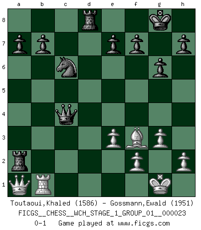 Last move : 0-1 2021 January 25 8:27:52 [Event "FICGS__CHESS__WCH_STAGE_1_GROUP_01__000023"] [Site "FICGS"] [Date "2020.11.05"] [Round "1"] [White "Toutaoui,Khaled"] [Black "Gossmann,Ewald"] [Result "0-1"] [WhiteElo "1586"] [BlackElo "1951"] 1.d4 Nf6 2.c4 g6 3.Nc3 d5 4.e3 Bg7 5.Nf3 O-O 6.Bd3 c5 7.cxd5 cxd4 8.Nxd4 Nxd5 9.Nxd5 Qxd5 10.Nf3 Rd8 11.Be2 Be6 12.O-O Nc6 13.Rb1 Qxa2 14.Bd2 Rac8 15.b3 Bg4 16.b4 Bxf3 17.Bxf3 Rxd2 18.Qc1 Rc2 19.Qd1 Rd8 20.Qe1 Bc3 21.Ra1 Qc4 22.Qb1 Bxa1 23.Qxa1 Qxb4 24.Rb1 Qc4 25.g3 Ra2 0-1 King's Indian defense, 3.Nc3 Kingside Castling by player Black (move 5) Kingside Castling by player White (move 12) Player Black won this chess game. Follow this game move after move (download)The passed pawn is a criminal, who should be kept under lock and key. Mild measures, such as police surveillance, are not sufficient. (Nimzovitch) Ich habe kein Problem mit Frauen, sondern nur mit dem Niveau ihres Schachspiels (Judith Polgar) Los asuntos humanos son como una partida de Ajedrez: solo aquellos que no lo toman seriamente, pueden ser llamados buenos jugadores. (Hung Tzu Ch'eng) Mon pion favori sur ma case favorite ! Bronstein en parlant d'un coup de pion en h5 quand il avait les Noirs. That's absurd. I love it. (Gregory House, House M.D.)