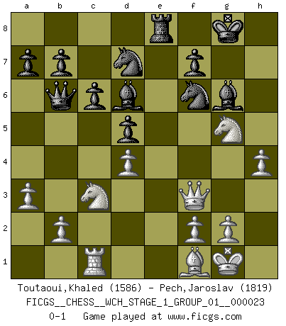 Last move : 0-1 2021 February 21 21:51:43 [Event "FICGS__CHESS__WCH_STAGE_1_GROUP_01__000023"] [Site "FICGS"] [Date "2020.11.05"] [Round "1"] [White "Toutaoui,Khaled"] [Black "Pech,Jaroslav"] [Result "0-1"] [WhiteElo "1586"] [BlackElo "1819"] 1.e4 e6 2.d4 d5 3.Nc3 Nf6 4.exd5 exd5 5.Nf3 Bd6 6.Be2 c6 7.O-O O-O 8.Re1 Re8 9.Bg5 Be6 10.h3 h6 11.Bh4 Nbd7 12.Bf1 Qc7 13.a3 g5 14.Bxg5 hxg5 15.Nxg5 Bf5 16.Rxe8+ Rxe8 17.Qf3 Bxc2 18.Rc1 Bg6 19.h4 Qb6 0-1 This chess game has been lost on time (started : 2020.11.05 12:58:20) French defense Kingside Castling by player White (move 7) Kingside Castling by player Black (move 7) Player Black won this chess game. Follow this game move after move (download)It began to feel as though you were playing against Chess itself. - On playing against Robert Fischer. (Walter Shipman) Ein typischer, sehr verbreiteter Gedankenschädling ist der, daß der betreffende Amateur von der Annanhme ausgeht, daß jeder einzelne Zug etwas zu leisten habe. (Aaron Nimzowitsch) El Ajedrez es un cuento de Hadas de las 1001 metidas de pata. (Savielly Tartakower) Il s'avisa de me proposer d'apprendre les échecs qu'il jouait un peu... me voilà forcené des échecs. J'achète un échiquier, je m'enferme dans ma chambre, j'y passe des jours et des nuits à vouloir apprendre par cur toutes les parties. (Jean-Jacques Rousseau, Confessions) Dave, my mind is going. I can feel it. (HAL 9000 in 2001, a space odyssey)
