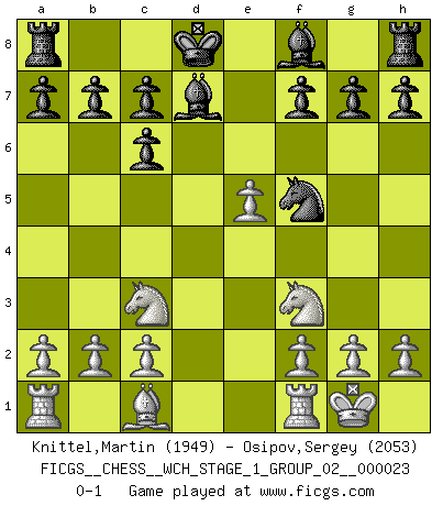 Last move : 0-1 2021 January 8 17:55:33 [Event "FICGS__CHESS__WCH_STAGE_1_GROUP_02__000023"] [Site "FICGS"] [Date "2020.11.05"] [Round "1"] [White "Knittel,Martin"] [Black "Osipov,Sergey"] [Result "0-1"] [WhiteElo "1949"] [BlackElo "2053"] 1.e4 e5 2.Nf3 Nc6 3.Bb5 Nf6 4.O-O Nxe4 5.d4 Nd6 6.Bxc6 dxc6 7.dxe5 Nf5 8.Qxd8+ Kxd8 9.Nc3 Bd7 0-1 This chess game has been lost on time (started : 2020.11.05 12:58:21) Ruy Lopez : Berlin defense, Open variation Kingside Castling by player White (move 4) Player Black won this chess game. Follow this game move after move (download)Before the endgame, the Gods have placed the middle game. (Siegbert Tarrasch) Um dein Spiel zu verbessern musst du zuallererst das Endspiel studieren, denn diese kann unabhängig studiert werden. Die Eröffnung und das Mittelspiel müssen immer in Bezug gesetzt werden zum Endspiel. (José Raúl Capablanca) No todos los artistas son jugadores de Ajedrez, pero todos los jugadores de Ajedrez son artistas. (Marcel Duchamp) La tactique est l'élément le plus important du milieu de jeu. (Siegbert Tarrasch) I don't know, I don't care, and it doesn't make any difference. (Albert Einstein)