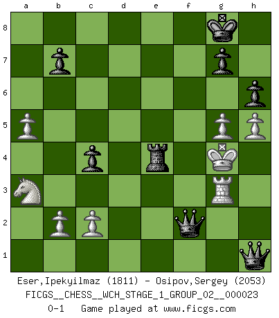 Last move : 0-1 2021 January 26 12:47:9 [Event "FICGS__CHESS__WCH_STAGE_1_GROUP_02__000023"] [Site "FICGS"] [Date "2020.11.05"] [Round "1"] [White "Eser,Ipekyilmaz"] [Black "Osipov,Sergey"] [Result "0-1"] [WhiteElo "1811"] [BlackElo "2053"] 1.a3 d5 2.g3 e5 3.Bg2 c5 4.d3 Nc6 5.a4 Be7 6.Na3 Nf6 7.Bd2 O-O 8.h3 Be6 9.h4 Qd7 10.h5 h6 11.e3 Rad8 12.Kf1 e4 13.Bh3 Ng4 14.Qe2 exd3 15.Qxd3 Rfe8 16.f3 c4 17.Qe2 Nxe3+ 18.Bxe3 Bxh3+ 19.Nxh3 Bc5 20.Bxc5 Rxe2 21.Kxe2 d4 22.Kf2 Qd5 23.Bxa7 Nxa7 24.Kg2 Nc6 25.Rhf1 Ne7 26.Nf4 Qc5 27.Rfe1 Nf5 28.g4 Ne3+ 29.Kg3 f5 30.Ng2 Nxg2 31.Kxg2 fxg4 32.fxg4 d3 33.a5 d2 34.Rg1 Re8 35.Kh3 Qf2 36.Rg3 Re2 37.Rh1 d1Q 38.g5 Qxh1+ 39.Kg4 Re4+ 0-1 Anderssen's Opening Kingside Castling by player Black (move 7) Promotion Queen by player Black (move 37) Player Black won this chess game. Follow this game move after move (download)Not only will I predict his triumph over Botvinnik, but I'll go further and say that he'll probably be the greatest Chess player that ever lived. (John Collins) Vom Schach wurde gesagt das Leben sei dafür nicht lange genug. Aber das ist der Fehler des Lebens, nicht des Schach'. (Irving Chernev) Botvinnik trataba de restarle el misterio al Ajedrez, siempre relacionandolo a situaciones de la vida ordinaria. El gustaba de llamar al Ajedrez un típico problema inexacto similar a aquellos de los cuales la gente siempre tiene que enfrentarse en la vida cotidiana. (Garry Kasparov) Des idées, des idées, j'en ai cent, j'en ai mille. Des bonnes, des mauvaises, applicables, irréalisables... Il suffit de faire le tri ! (Roos) Dave, my mind is going. I can feel it. (HAL 9000 in 2001, a space odyssey)