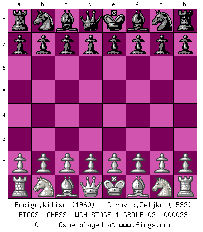 Last move : 0-1 2020 December 5 15:0:2 [Event "FICGS__CHESS__WCH_STAGE_1_GROUP_02__000023"] [Site "FICGS"] [Date "2020.11.05"] [Round "1"] [White "Erdigo,Kilian"] [Black "Cirovic,Zeljko"] [Result "0-1"] [WhiteElo "1960"] [BlackElo "1532"] 0-1 This chess game has been lost on time (started : 2020.11.05 12:58:21) Player Black won this chess game. Follow this game move after move (download)There's never before been a Chess player with such a thorough knowledge of the intricacies of the game and such an absolutely indomitable will to win. I think Bobby is the greatest player that ever lived. (Lisa Lane) Im Fernschach kannst du während dem Spiel rauchen. (John Christen Knudsen) Es muy difícil jugar en contra de la teoría de Einstein. - en su primera derrota en contra de Fischer (Mikhail Tal) Mais l'homme est une créature légère et illogique : semblable au joueur d'échecs, il n'aime que le processus du but à atteindre, non le but lui-même. (Dostoïevsky) Before all elsed, be armed. (Niccolo Machiavelli)