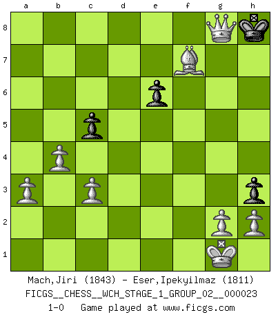 Last move : 1-0 2021 May 16 15:9:11 [Event "FICGS__CHESS__WCH_STAGE_1_GROUP_02__000023"] [Site "FICGS"] [Date "2020.11.05"] [Round "1"] [White "Mach,Jiri"] [Black "Eser,Ipekyilmaz"] [Result "1-0"] [WhiteElo "1843"] [BlackElo "1811"] 1.Nf3 f6 2.e4 b6 3.d4 Bb7 4.Bd3 e6 5.O-O Bd6 6.a3 Nc6 7.Re1 e5 8.c3 Kf8 9.Be3 h6 10.Nbd2 h5 11.Nh4 Nce7 12.dxe5 Bxe5 13.f4 Bd6 14.b4 c6 15.e5 Bc7 16.Ndf3 Qe8 17.exf6 gxf6 18.f5 Qf7 19.Ng6+ Nxg6 20.fxg6 Qg7 21.Qd2 Re8 22.Bf4 Bxf4 23.Rxe8+ Kxe8 24.Qxf4 Kd8 25.Re1 Ne7 26.Qb8+ Bc8 27.Nd4 f5 28.Qxa7 Qxg6 29.Qxb6+ Ke8 30.Nxf5 Qe6 31.Rxe6 dxe6 32.Nxe7 Kxe7 33.Qc5+ Kf6 34.Qf2+ Kg7 35.Qd4+ Kg8 36.Qd8+ Kf7 37.Qxh8 Bd7 38.Qd8 Be8 39.Be2 h4 40.Bh5+ Kg7 41.Qe7+ Kh6 42.Bxe8 c5 43.Qf6+ Kh7 44.Bf7 h3 45.Qg6+ Kh8 46.Qg8+ 1-0 Reti Opening Kingside Castling by player White (move 5) Player White won this chess game. Follow this game move after move (download)Bobby just drops the pieces and they fall on the right squares. (Miguel Najdorf) Frage: Gibt es etwas was Sie mehr lieben als Autobahnen ohne Tempobegrenzungen? - Antwort: Deutsche Frauen ohne Tempobegrenzungen. (Loek van Wely) Las leyes del Ajedrez no permiten una libre elección: tienes que mover quieras o no. (Emanuel Lasker) Plusieurs personnes se sont demandées comment Tal faisait pour gagner... En fait, c'est très simple ! Il met ses pièces au centre de l'échiquier et les sacrifie quelque part ! (David Bronstein) If computers get too powerful, we can organize them into committees. That'll do them in. (Anonymous)