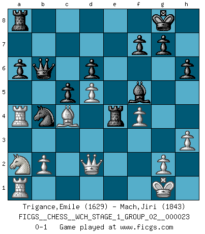 Last move : 0-1 2021 February 14 8:29:48 [Event "FICGS__CHESS__WCH_STAGE_1_GROUP_02__000023"] [Site "FICGS"] [Date "2020.11.05"] [Round "1"] [White "Trigance,Emile"] [Black "Mach,Jiri"] [Result "0-1"] [WhiteElo "1629"] [BlackElo "1843"] 1.d4 Nf6 2.c4 c5 3.d5 b5 4.Nf3 e6 5.Bg5 exd5 6.cxd5 h6 7.Bxf6 Qxf6 8.Qc2 Be7 9.e4 Qb6 10.a4 bxa4 11.Rxa4 d6 12.Nc3 O-O 13.Be2 Na6 14.O-O Nb4 15.Qd2 a6 16.Rfa1 Bf6 17.h3 Re8 18.e5 Bxe5 19.Nxe5 Rxe5 20.Bc4 Bf5 21.f4 Re7 22.Na2 Re4 0-1 Benko gambit Kingside Castling by player Black (move 12) Kingside Castling by player White (move 14) Player Black won this chess game. Follow this game move after move (download)You can only get good at Chess if you love the game. (Bobby Fischer) Computer sind die einzigen Gegner, die nicht immer eine Ausrede auf Lager haben, wenn sie gegen mich verlieren. (Robert James Fischer) La última cosa en que Fischer estaba interesado era en tonterías, siempre y cuando el Ajedrez estuviera involucrado. (Elie Agur) Aux échecs, l'amour-propre est satisfait quand on remporte la victoire, mais il n'y a pas de honte à être battu. (Benjamin Franklin) . 'gn is not allowed in chess unless n is an integer between 1 and 8 inclusive, where 1 and 8 are to interpreted as the standard numerals standing for integers in the ordered real-closed field R, with the *canonical* ordering. (As opposed to, say, an integer in the domain Z[2+i*sqrt(5)] or an integer in some exotic Grothendieck topos). (Normajean Yates)