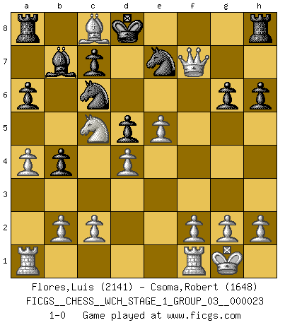 Last move : 1-0 2020 November 29 18:53:51 [Event "FICGS__CHESS__WCH_STAGE_1_GROUP_03__000023"] [Site "FICGS"] [Date "2020.11.05"] [Round "1"] [White "Flores,Luis"] [Black "Csoma,Robert"] [Result "1-0"] [WhiteElo "2141"] [BlackElo "1648"] 1.d4 b5 2.e4 Bb7 3.Nd2 Nf6 4.e5 Ng8 5.Ngf3 a6 6.Bd3 e6 7.a4 b4 8.O-O d6 9.Ne4 d5 10.Bg5 Be7 11.Nc5 Qc8 12.Bxe7 Nxe7 13.Ng5 h6 14.Ngxe6 fxe6 15.Qh5+ Kd8 16.Qf7 Nbc6 17.Nxe6+ Kd7 18.Bf5 g6 19.Nc5+ Kd8 20.Bxc8 1-0 Polish defense Kingside Castling by player White (move 8) Player White won this chess game. Follow this game move after move (download)When your house is on fire, you can't be bothered with the neighbors. Or, as we say in Chess, if your King is under attack you don't worry about losing a Pawn on the Queen's side. (Gary Kasparov) Viele Opfer benötigen überhaupt keine konkrete Berechnung. Es genügt sich die entstehende Position kurz vorzustellen, um uns davon zu überzeugen, dass das Opfer korrekt ist. (Mikhail Nekhemyevich Tal) Juega la Apertura como un libro, el Juego Medio como un mago y los Finales como una máquina. (Spielmann) Pour moi, les échecs ne sont pas un jeu mais un art. (Alexandre Alekhine) Every vice is only an exaggeration of a necessary and virtuous function. (Ralph Waldo Emerson, Journals 1936)